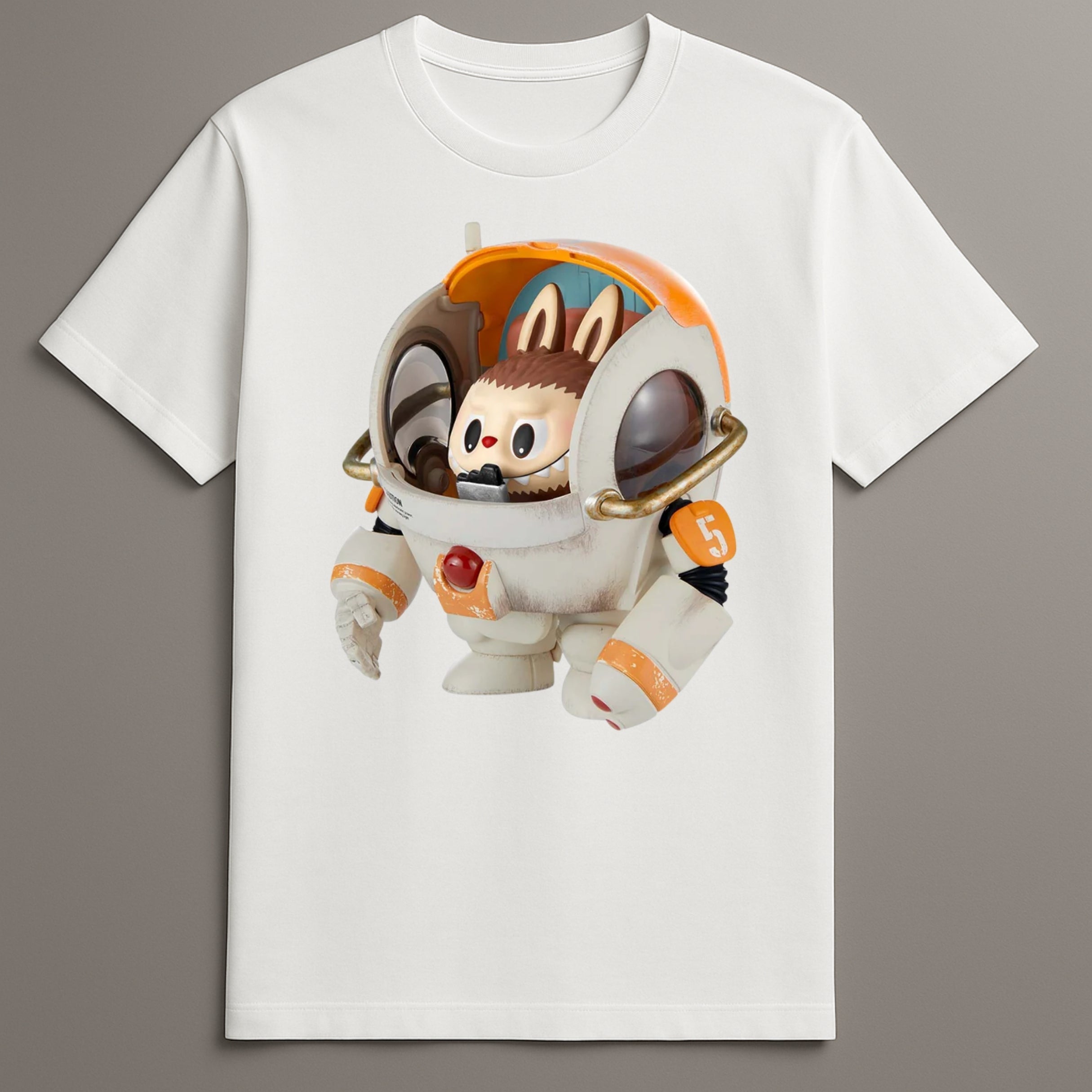 Labubu Mecha Print Tee Showcasing Retro Artwear And Mecha Graphics
