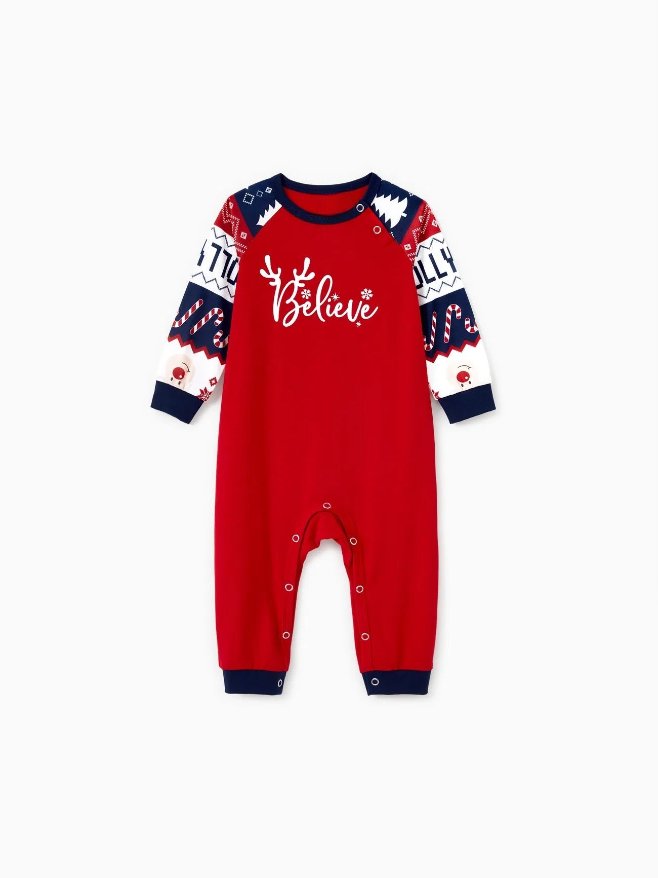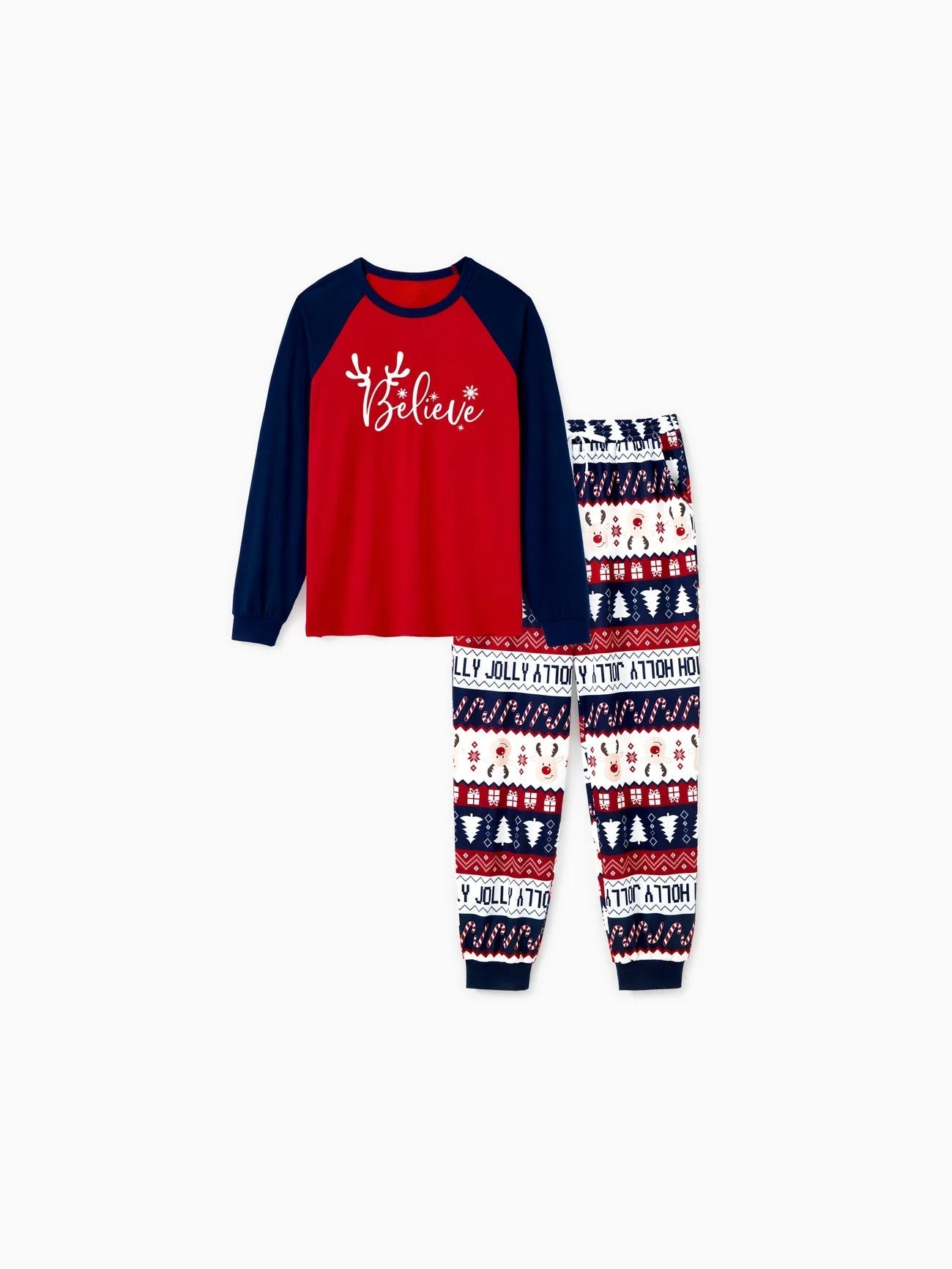 • Design: Features a “Believe” text print on the tops with contrasting sleeves, paired with pants adorned with holiday-themed patterns such as snowflakes, reindeer, and festive lettering.