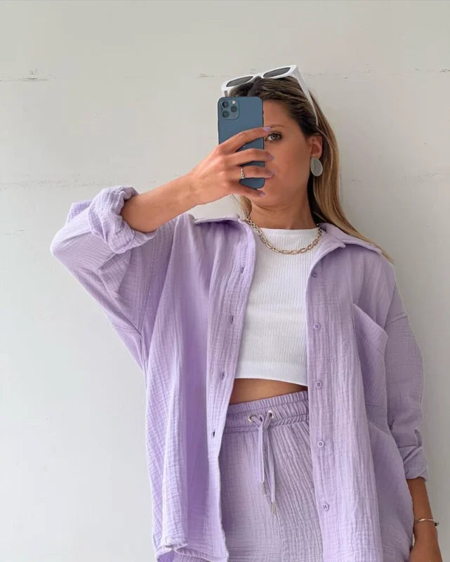 This Casual Long Sleeve Two Piece Short Set features an airy, long-sleeve button-up shirt alongside coordinating shorts with an adjustable drawstring waist for a comfortable fit. Designed with a lightweight, textured fabric, it offers a smart-casual look that's versatile for various occasions. The outfit's relaxed cut ensures ease of movement, making it a go-to choice for leisurely days or casual meet-ups.