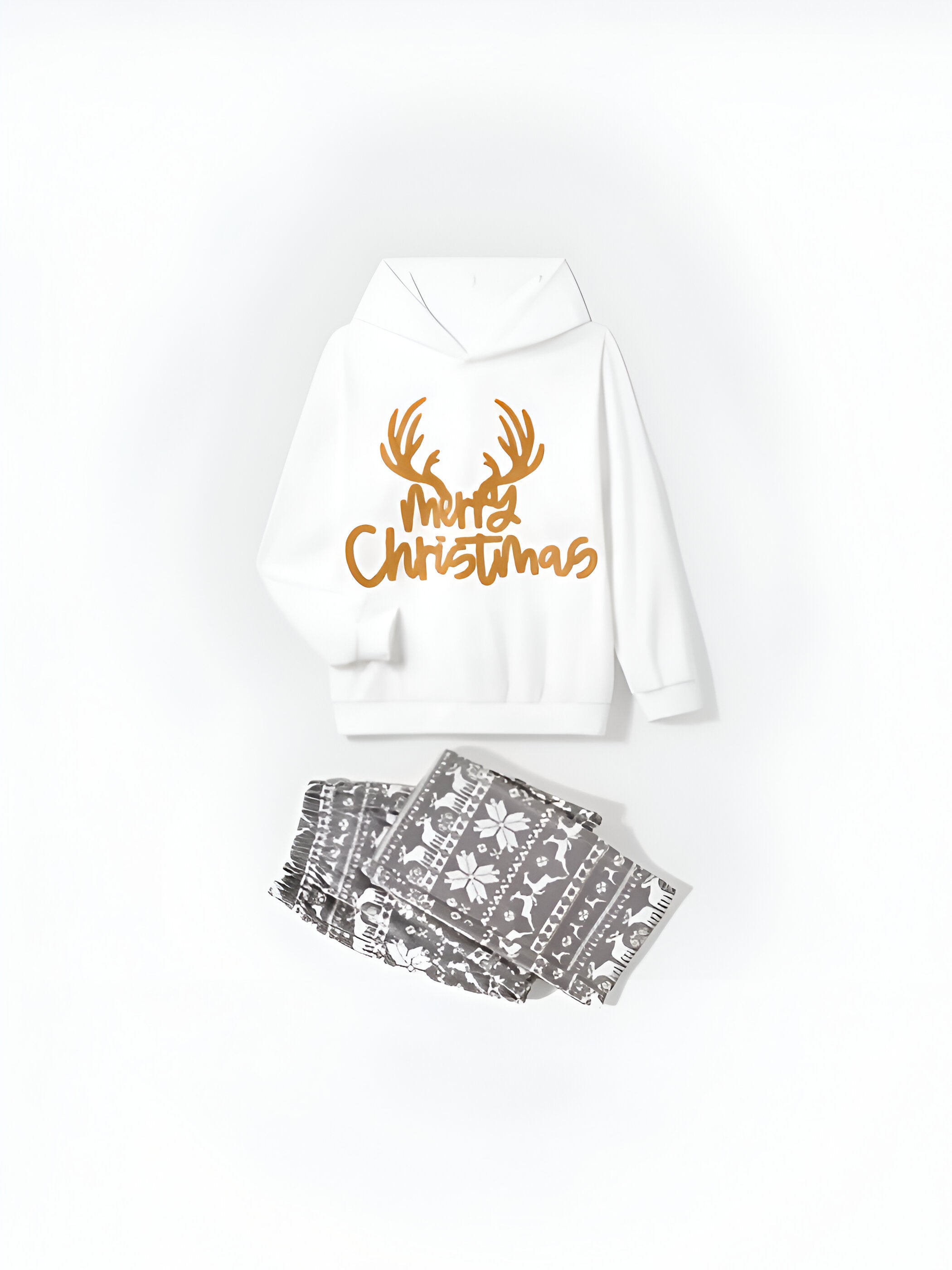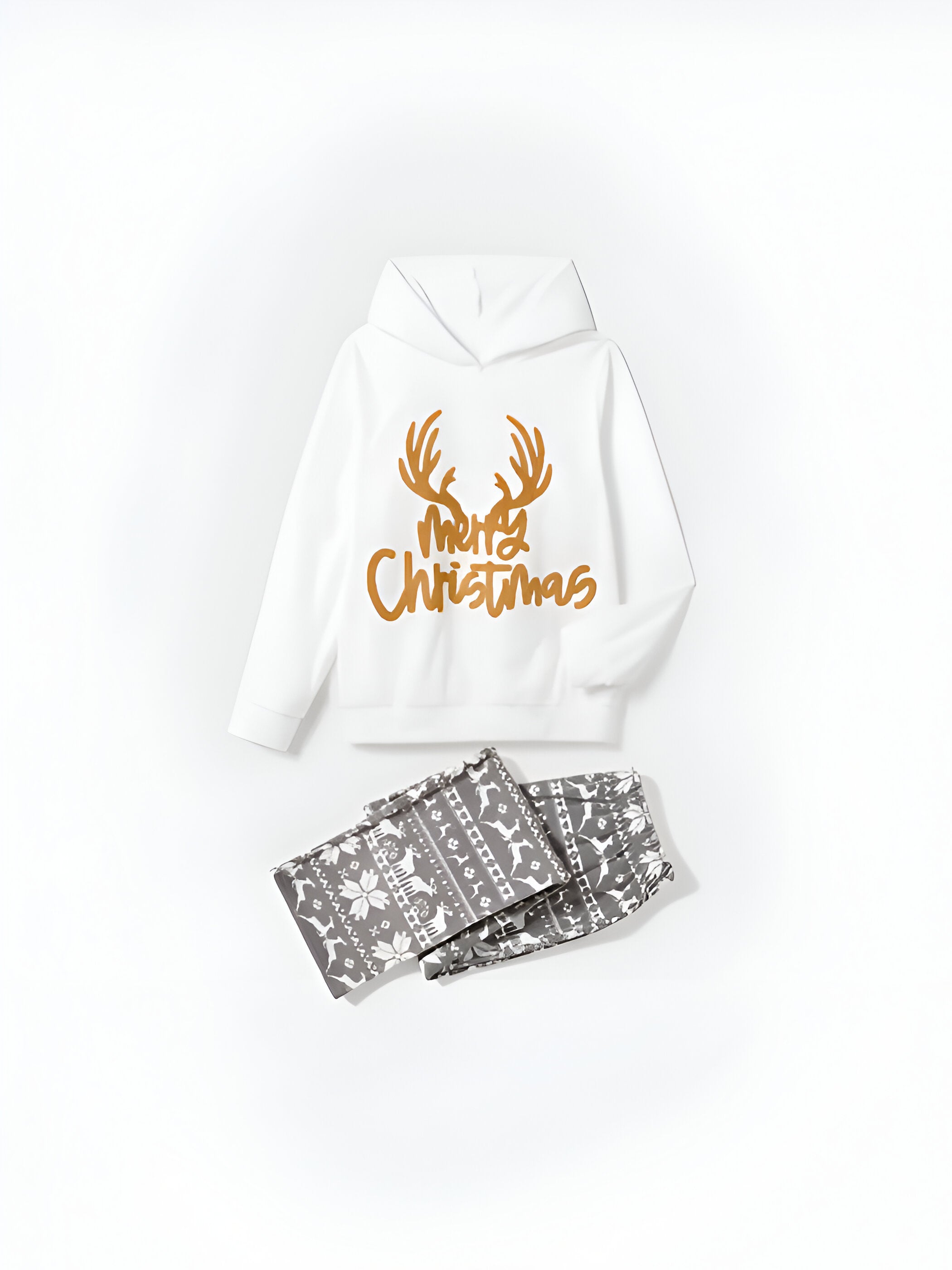 Pattern: Features embroidered "Merry Christmas" lettering on the hooded top, paired with matching patterned bottoms with festive holiday motifs.