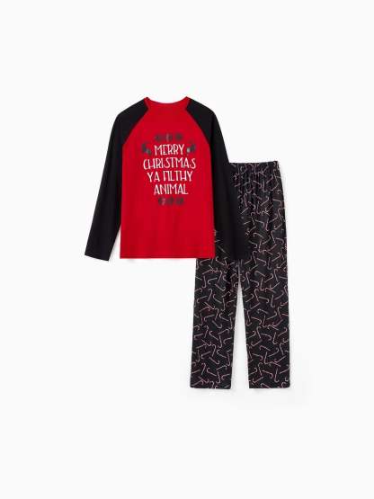 • Pattern: Bold letter print on the tops with a festive "Merry Christmas Ya Filthy Animal" message, paired with candy cane-printed bottoms.