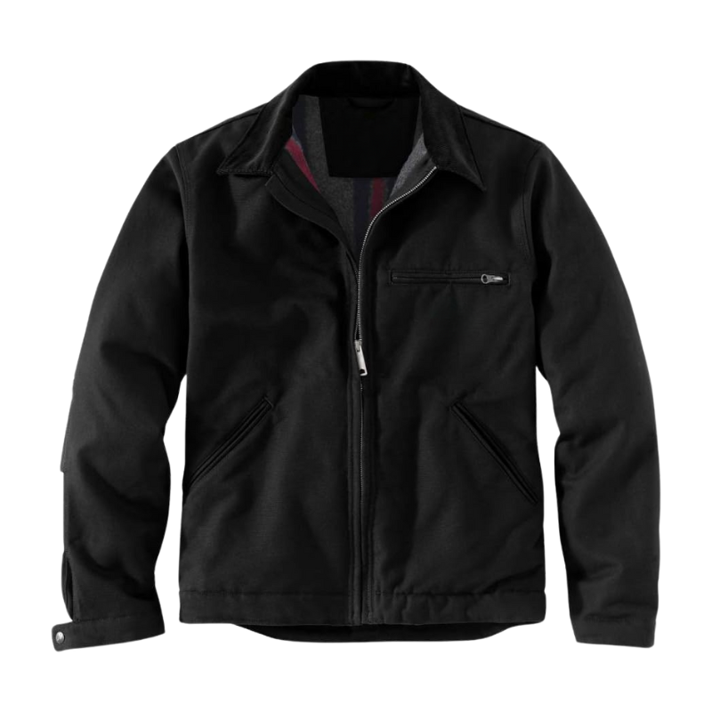 Design: Features a classic zip-up front with a fold-down collar and a minimalist, sleek look, suitable for casual or semi-formal wear.