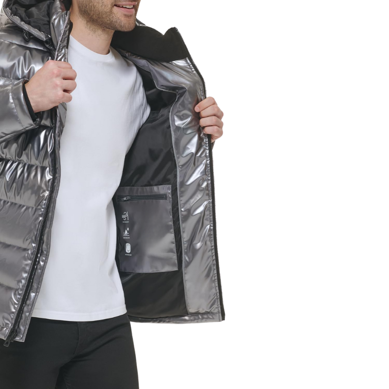The Hooded Holographic Puffer Jacket offers a modern, standout look paired with practical features for everyday wear. Its eye-catching holographic finish adds a unique style element, while the water-resistant fabric helps keep you dry during light rain. Designed to provide warmth without unnecessary bulk, it ensures comfort throughout the year. Functional elements, such as multiple pockets for essentials and adjustable cuffs with a zip closure, enhance both convenience and fit.