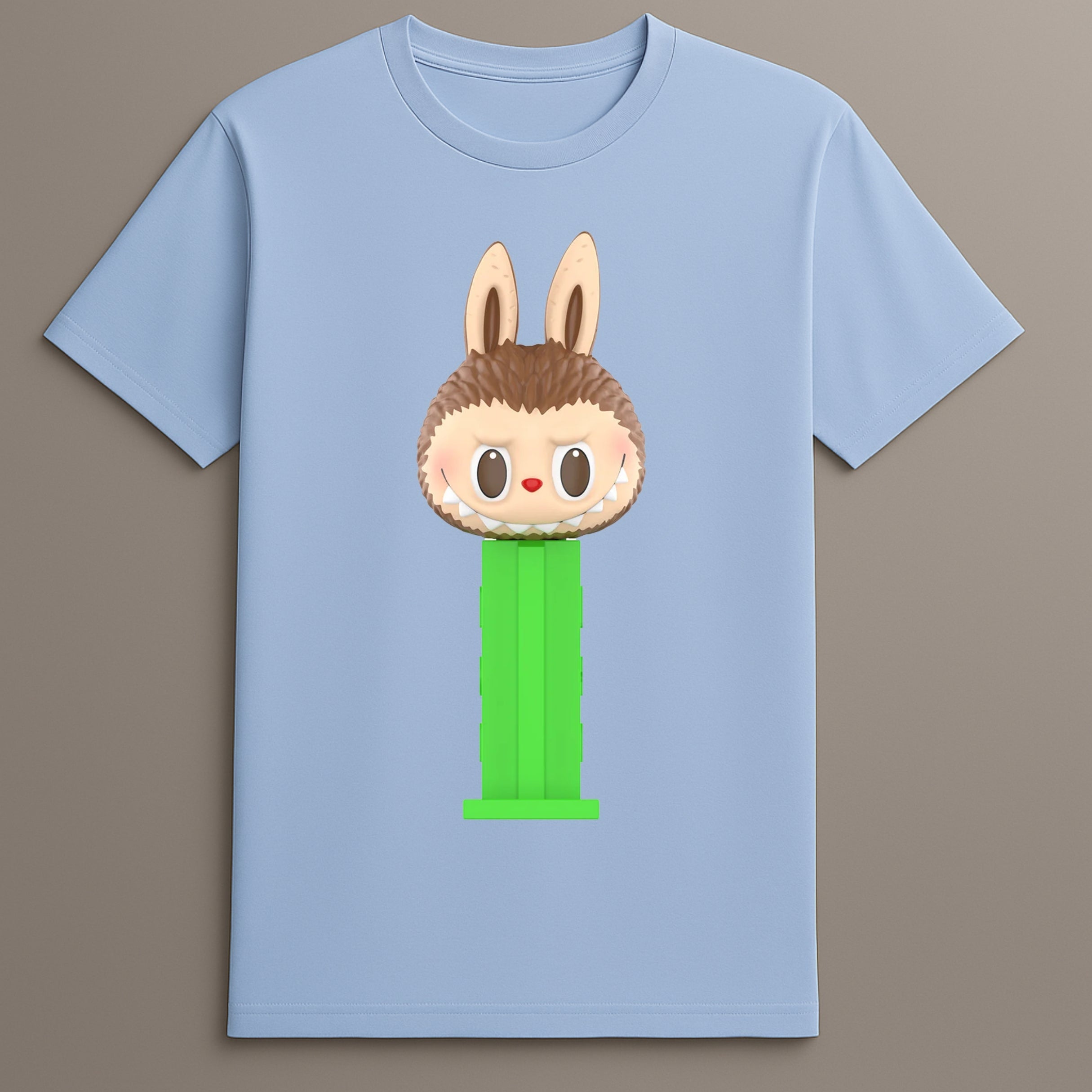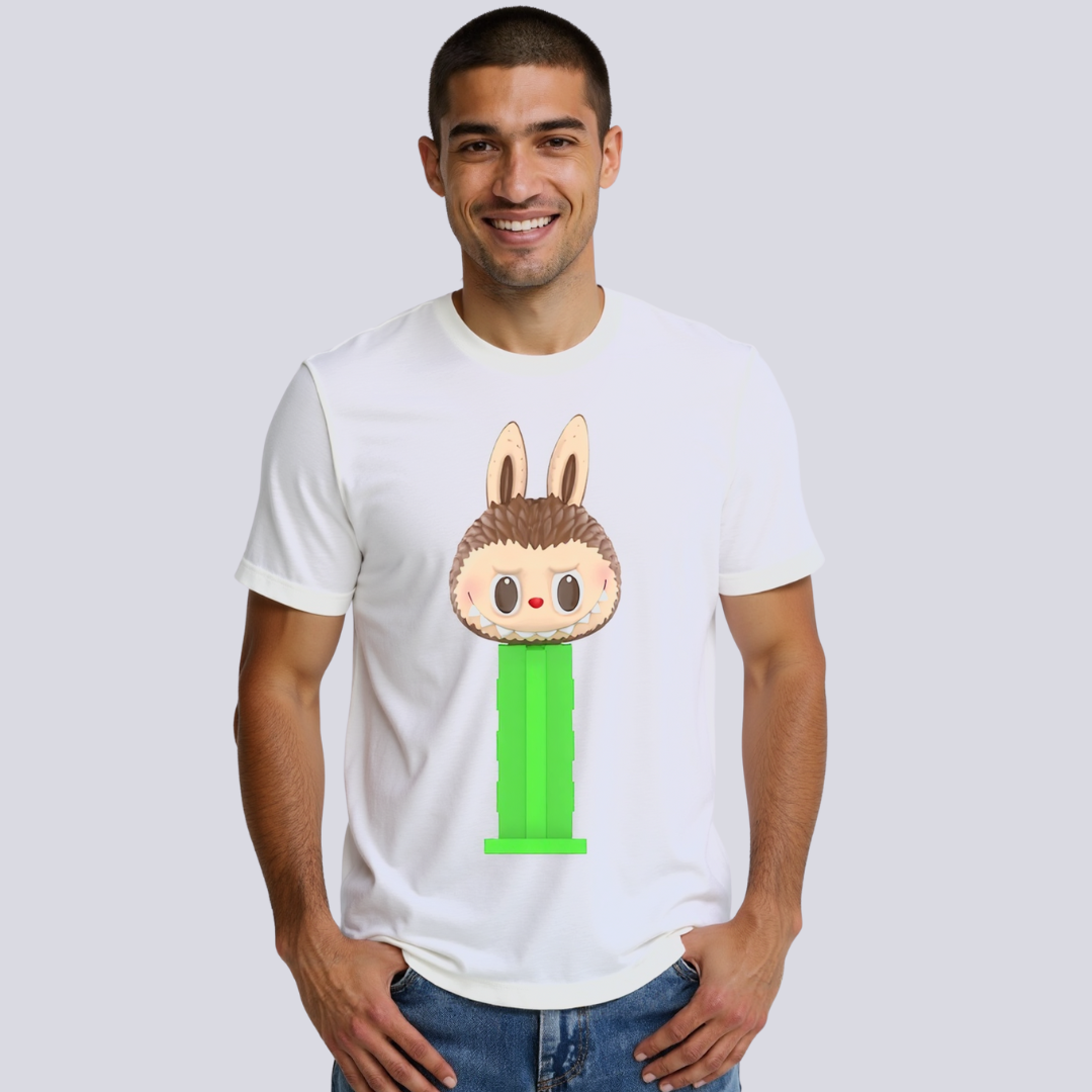 The Labubu Bunny Toy T-Shirt adds a nostalgic yet current element to your casual wardrobe. Featuring a character-driven design that mirrors vintage toy dispensers, this shirt blends pop culture themes with clean, wearable form. Its visual focus is a bunny placed atop a vibrant green stand, inspired by retro candy dispenser shapes. The graphic is centered and bold, making this piece a conversation starter that still works for everyday wear. Designed for those who enjoy collectible prints and themed attire, it’s a standout among basic tees.