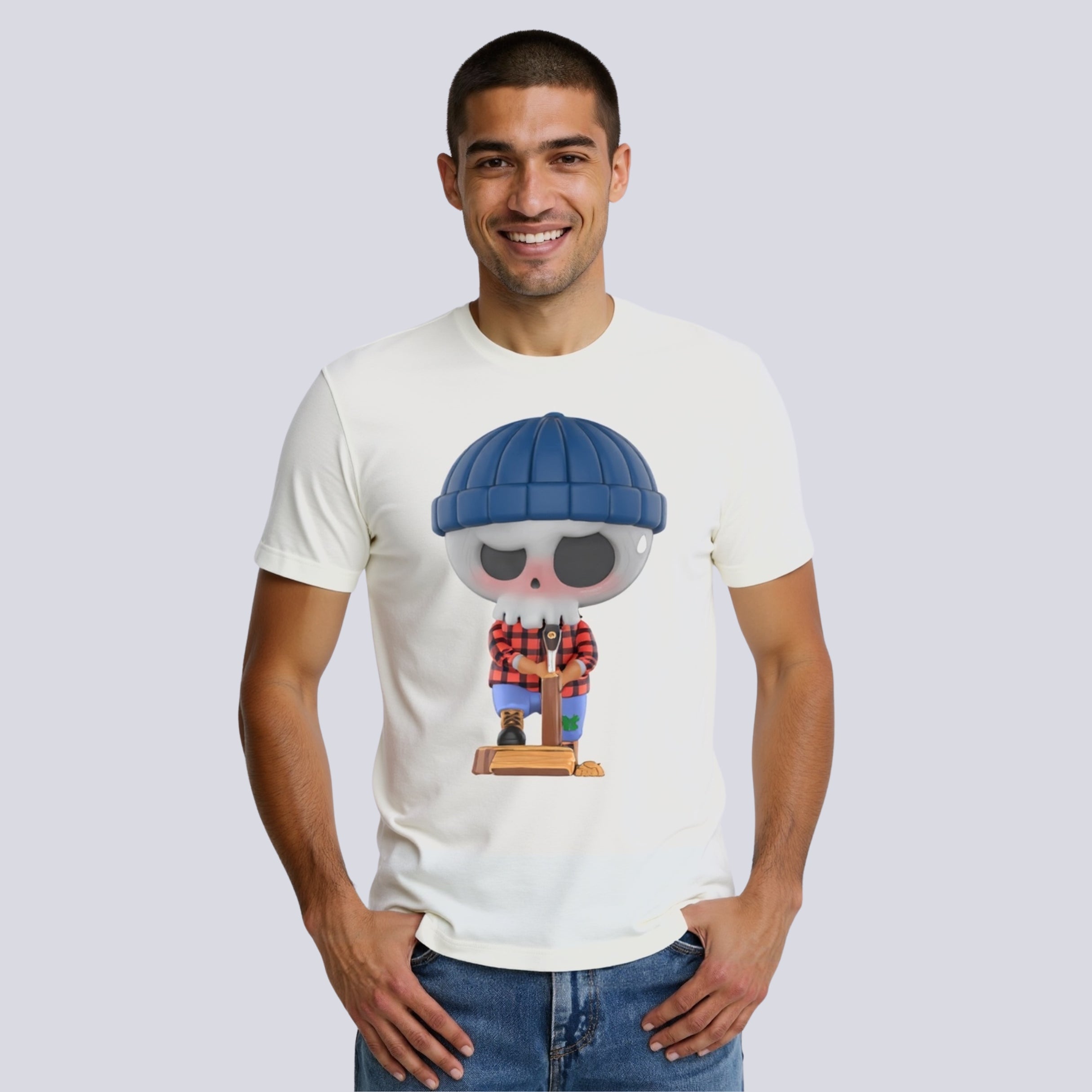 This tee speaks through art rather than text. It shares a calm scene through cartoon design. The simple action of chopping wood makes it visually soothing. The material supports all-day use. It holds shape after folding or washing. The shirt does not cling or pull. It keeps a straight form for flexible styling. The forest image connects to nature. The cartoon character keeps it creative. This makes it different from common print tees.