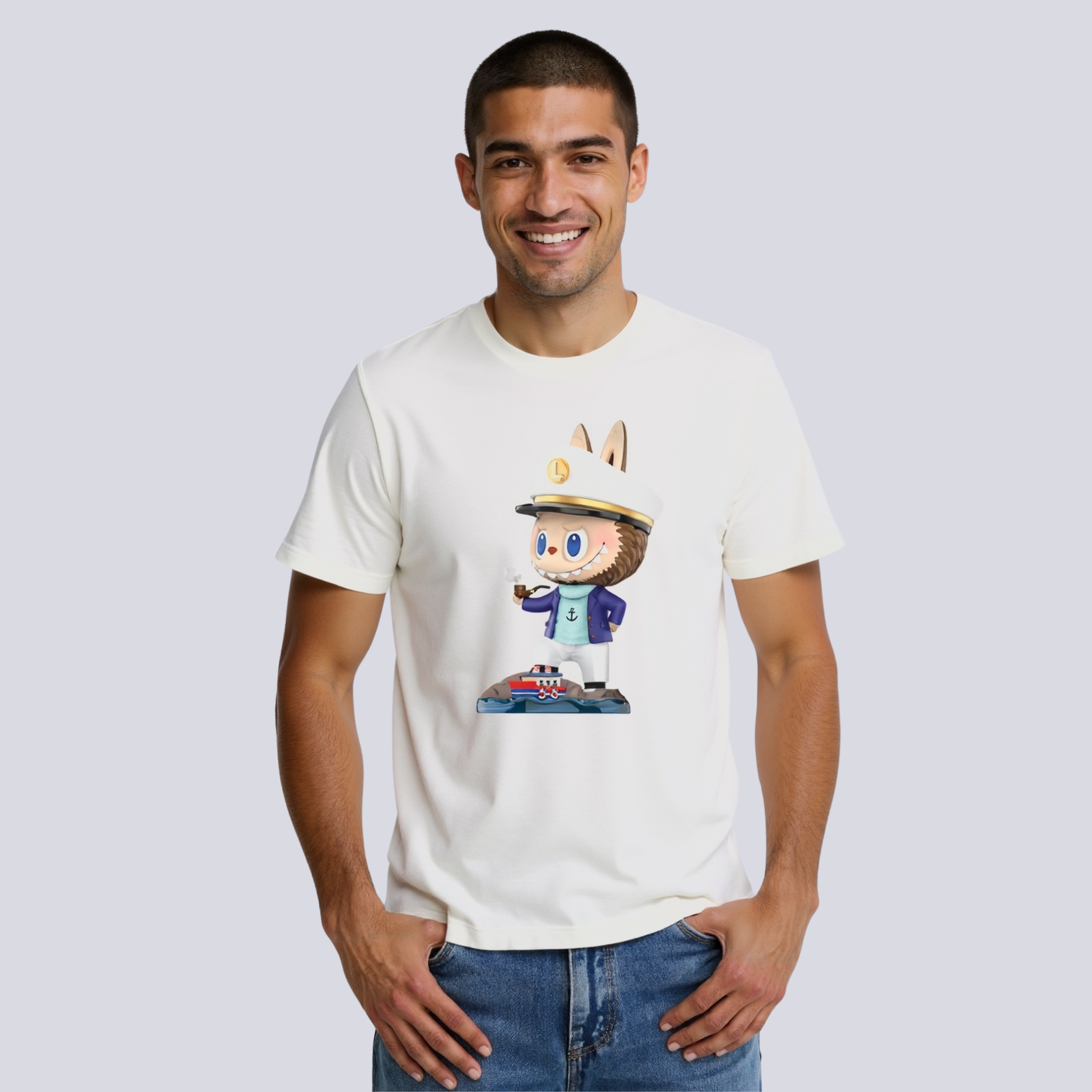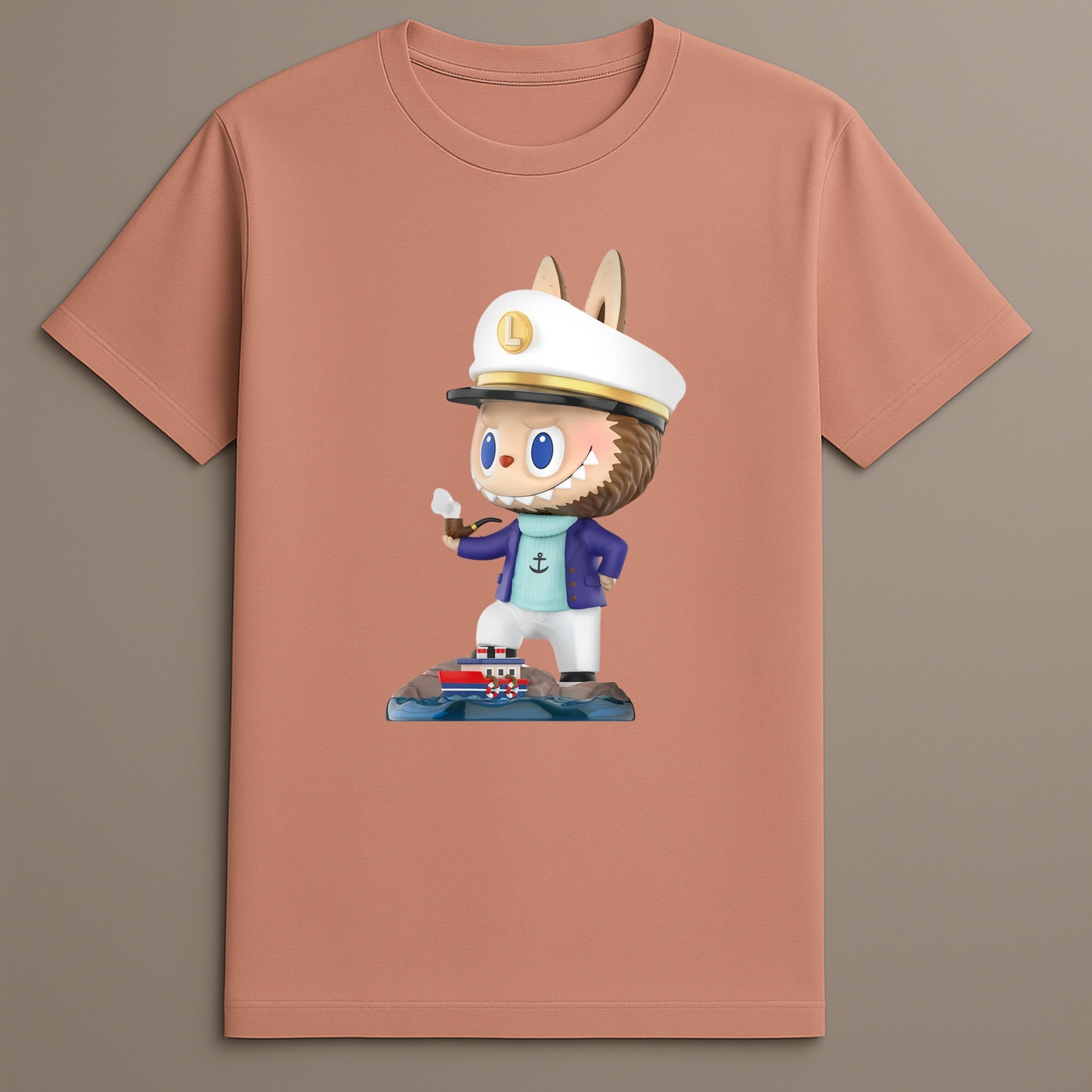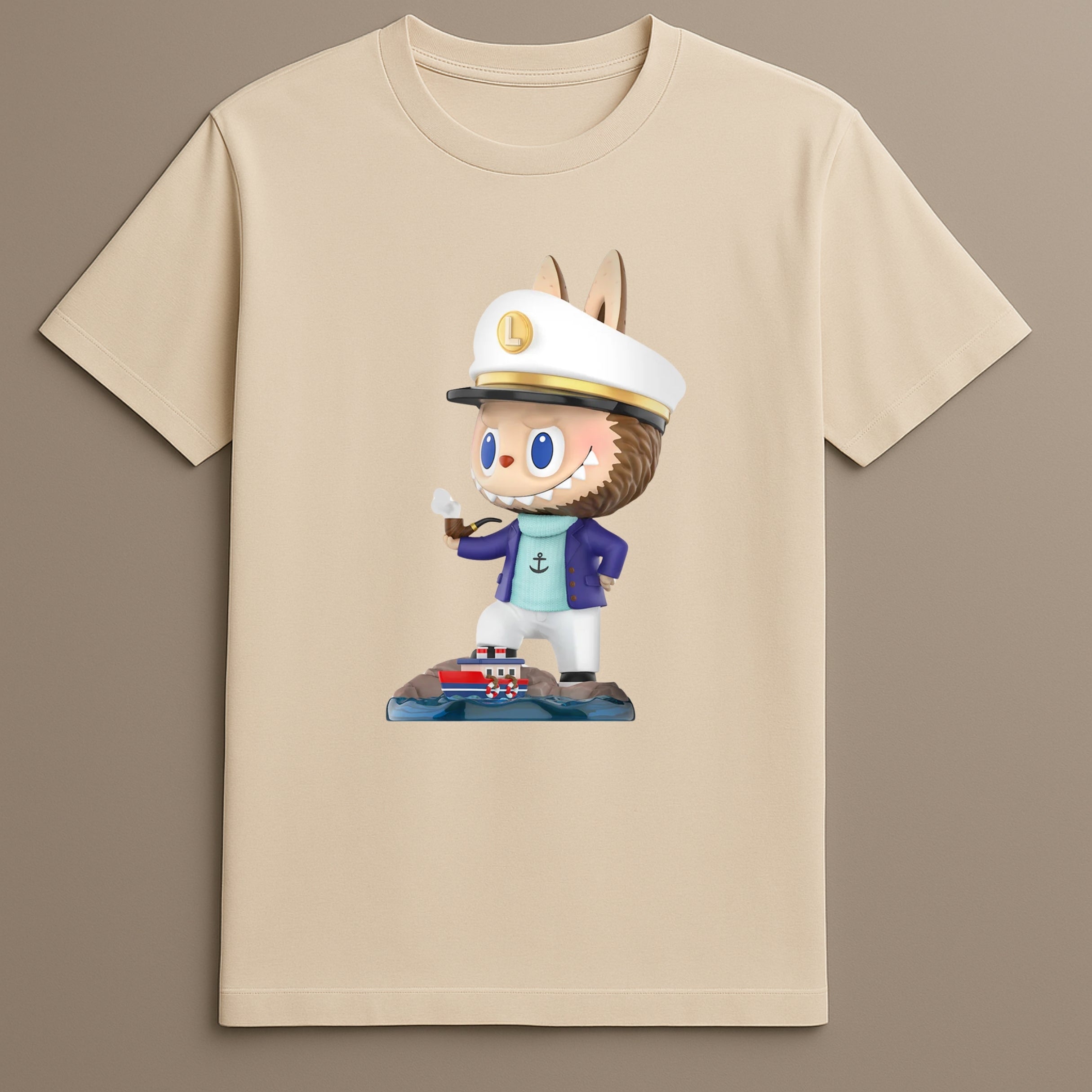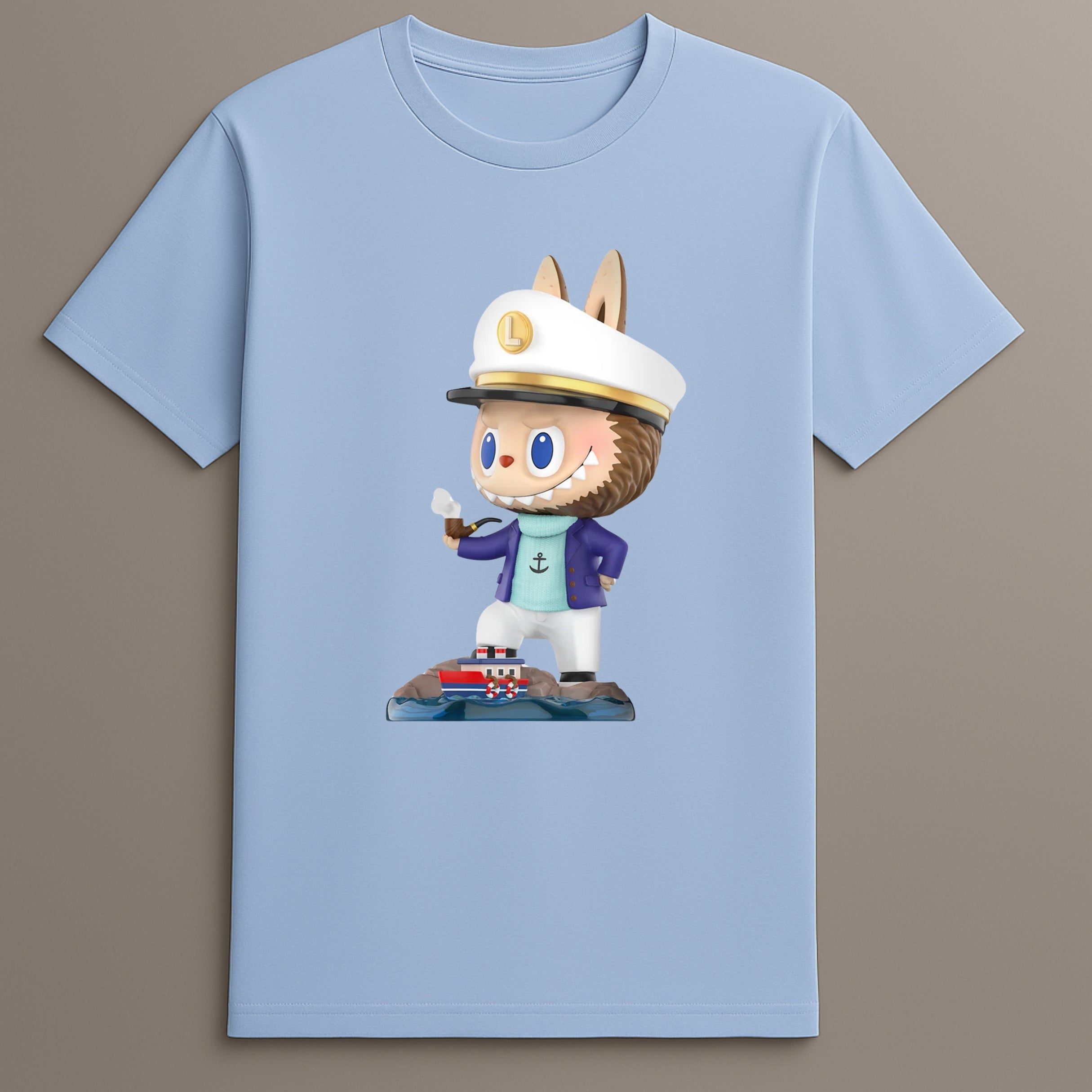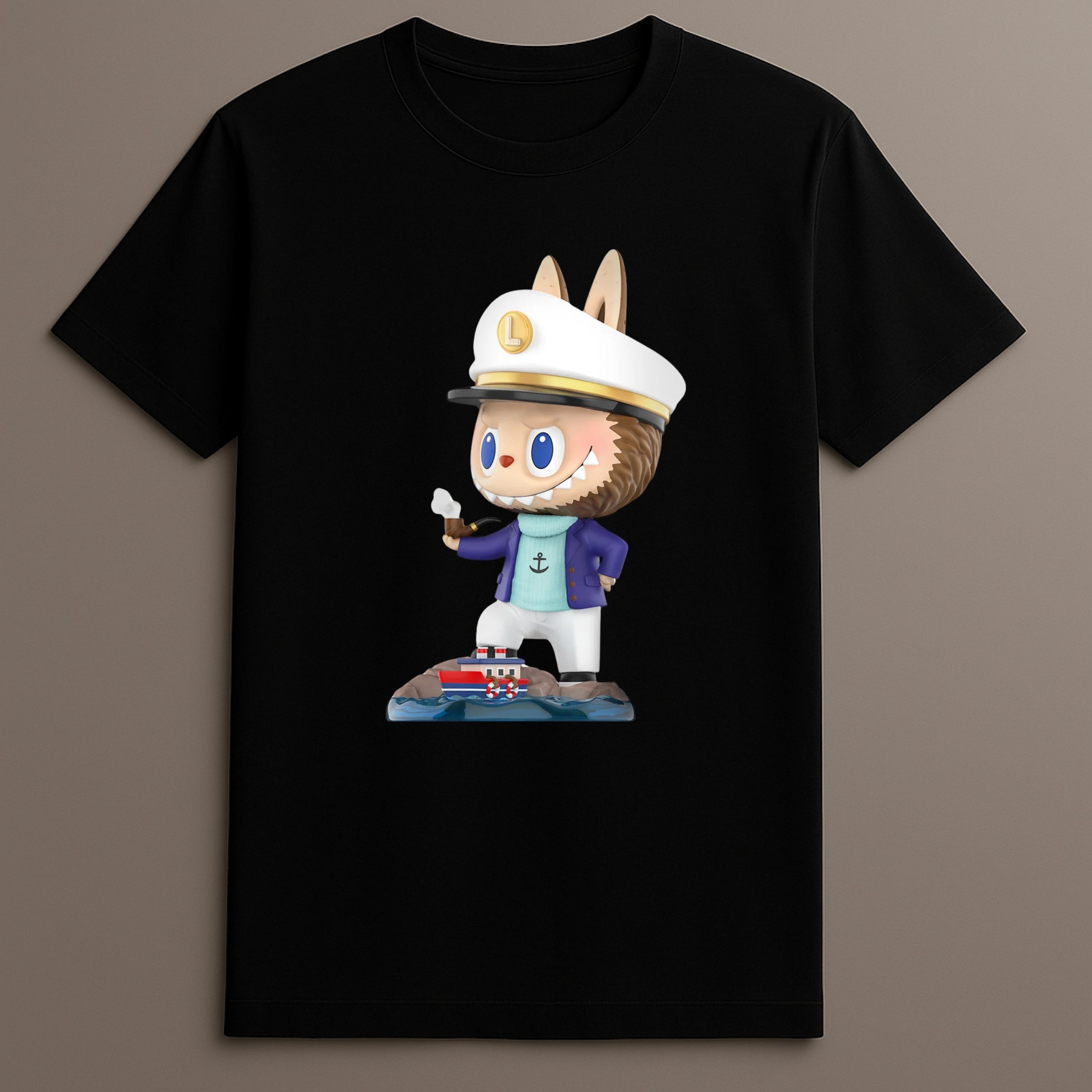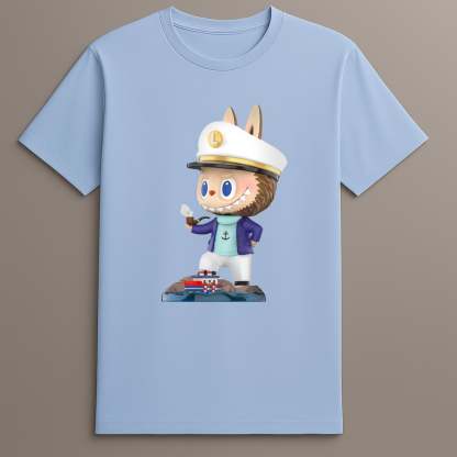 The Labubu Captain Graphic Shirt presents a fresh visual narrative through a character-themed graphic print rooted in collectible toy design. This short-sleeved T-shirt draws inspiration from the nautical world while celebrating the adventurous spirit of the Pop Mart Labubu tee collection.