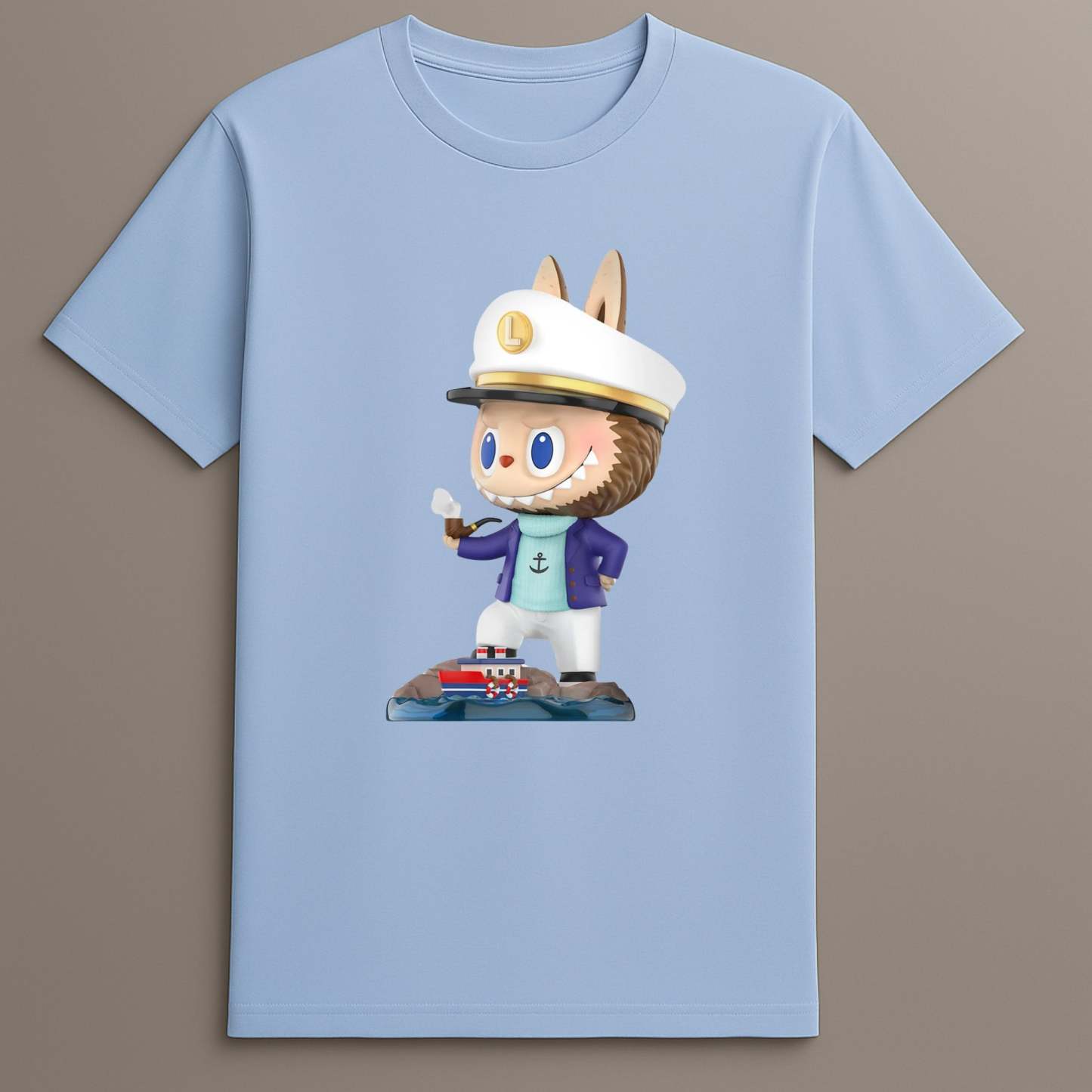 Nautical Character Print A centered design shows Labubu in full captain attire, standing next to a boat on stylized ocean waves.