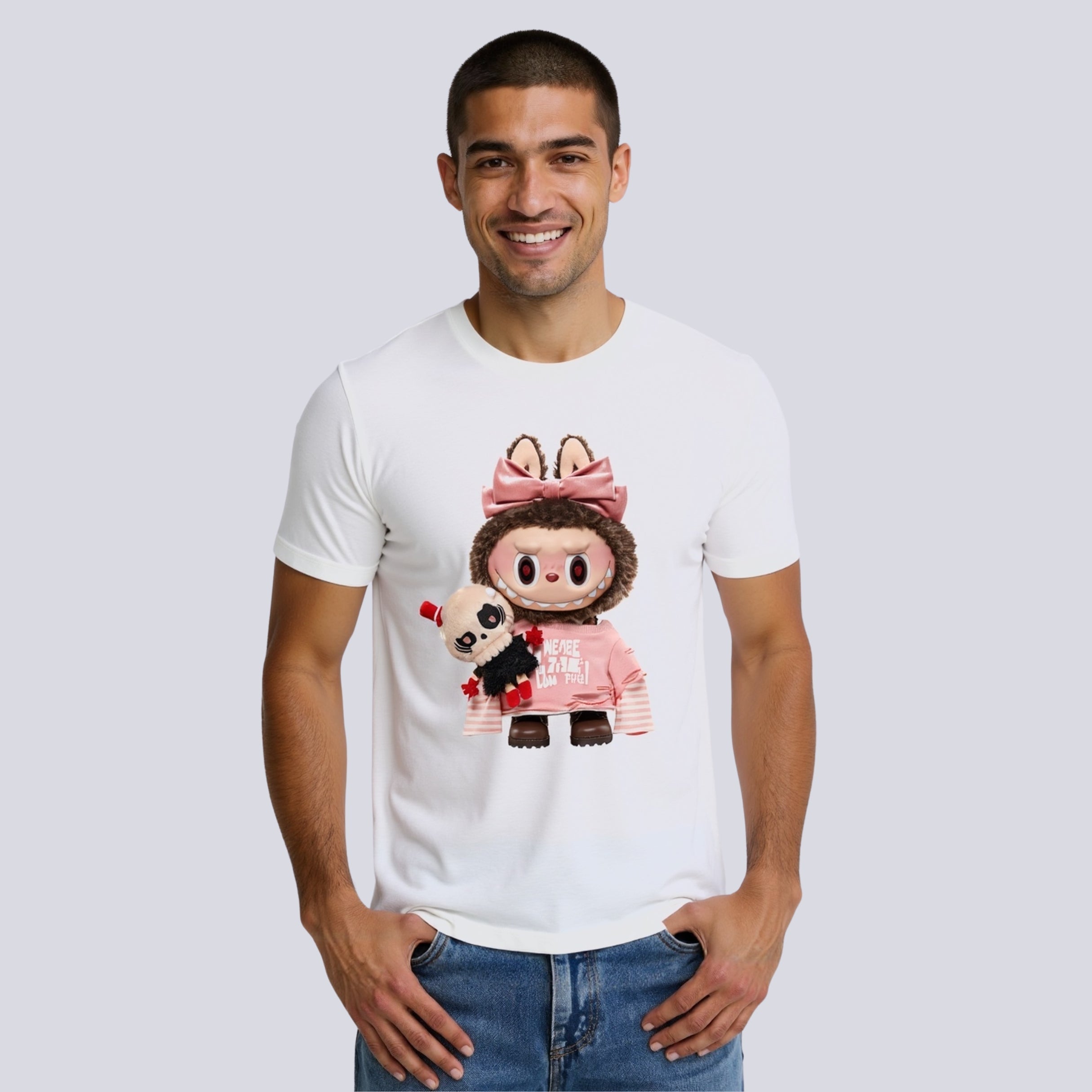 This printed graphic shirt shows Labubu from the Catch Me If You Like Me series. The image is bold and centered. The print does not fade quickly under regular care. Its size fits the shirt layout well creating visual focus without imbalance. This gives the shirt structure and personality.