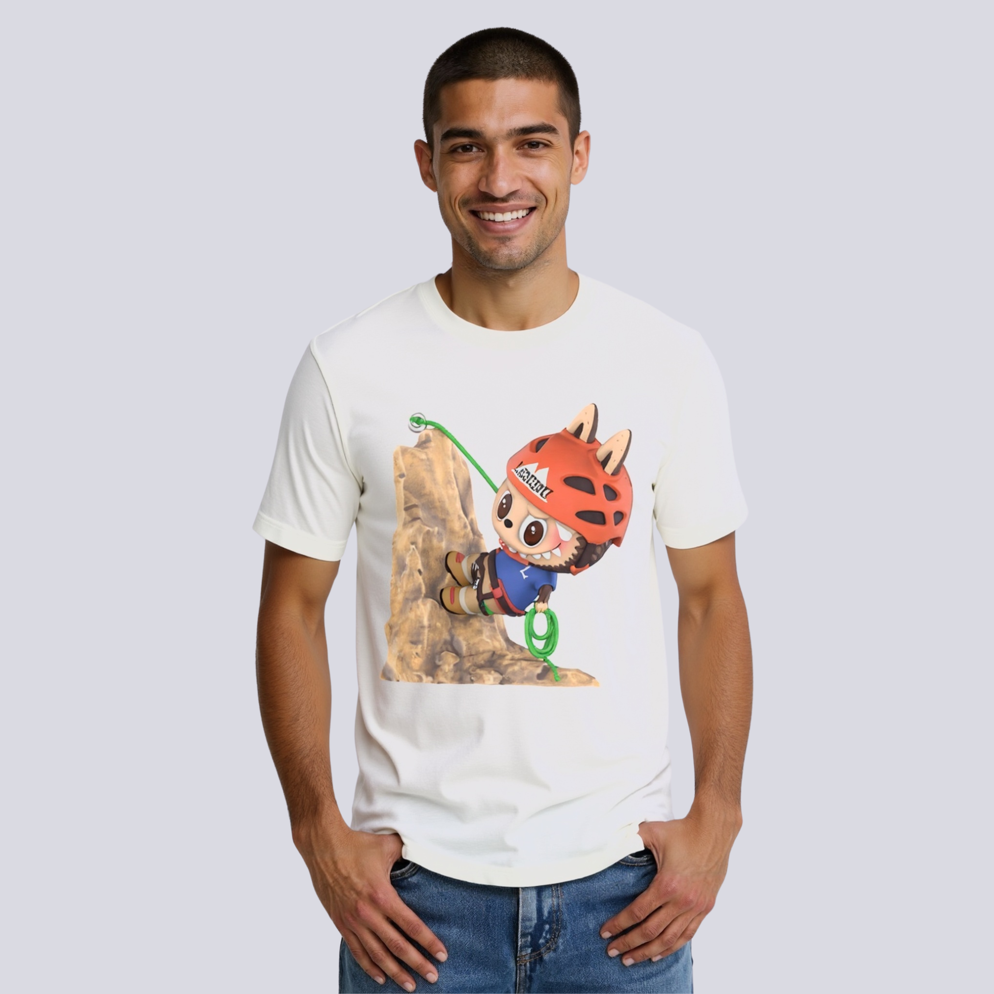This cartoon climber shirt brings an illustrated edge to a staple t-shirt design. The central print adds personality without being overwhelming, making it a fun yet balanced option for any casual wardrobe.