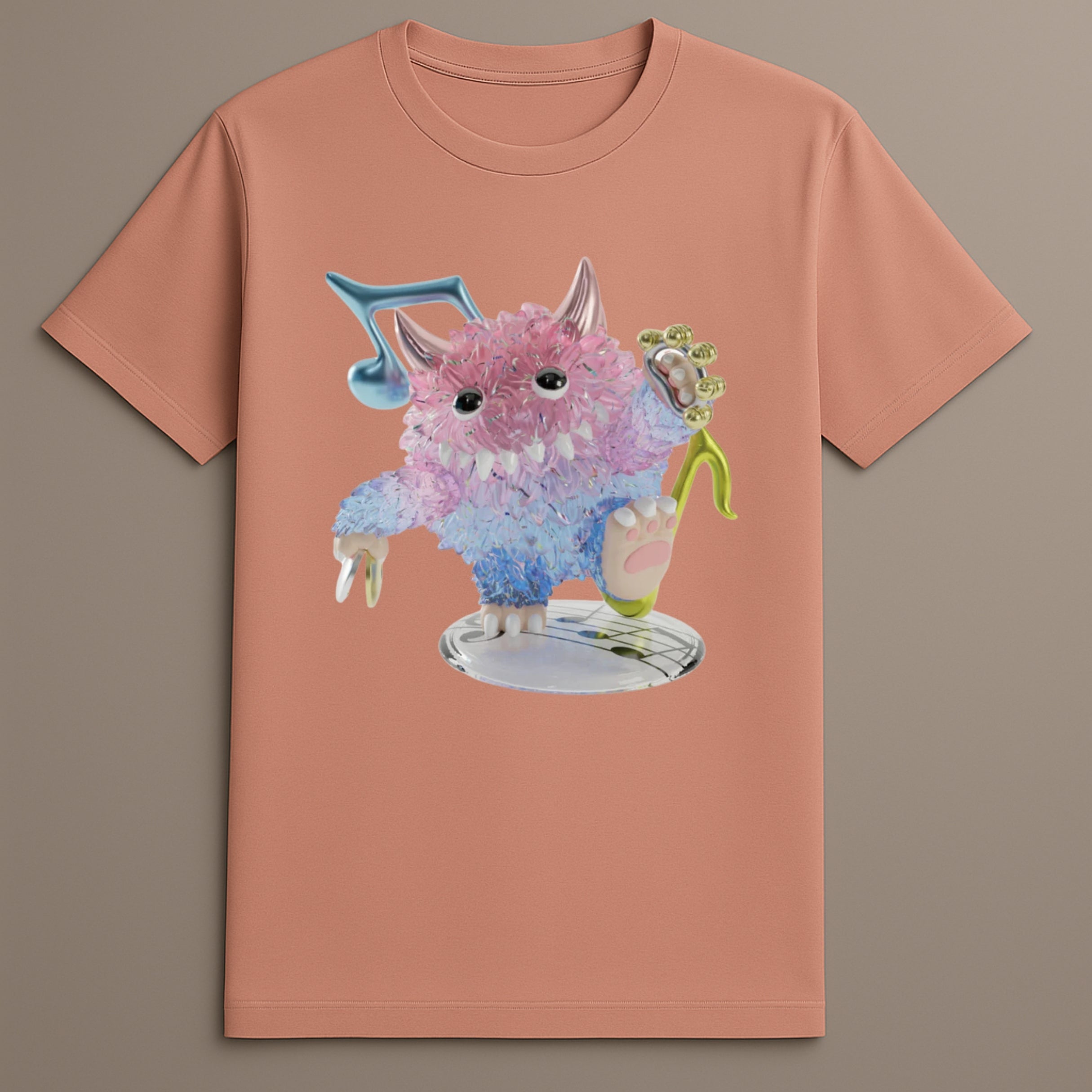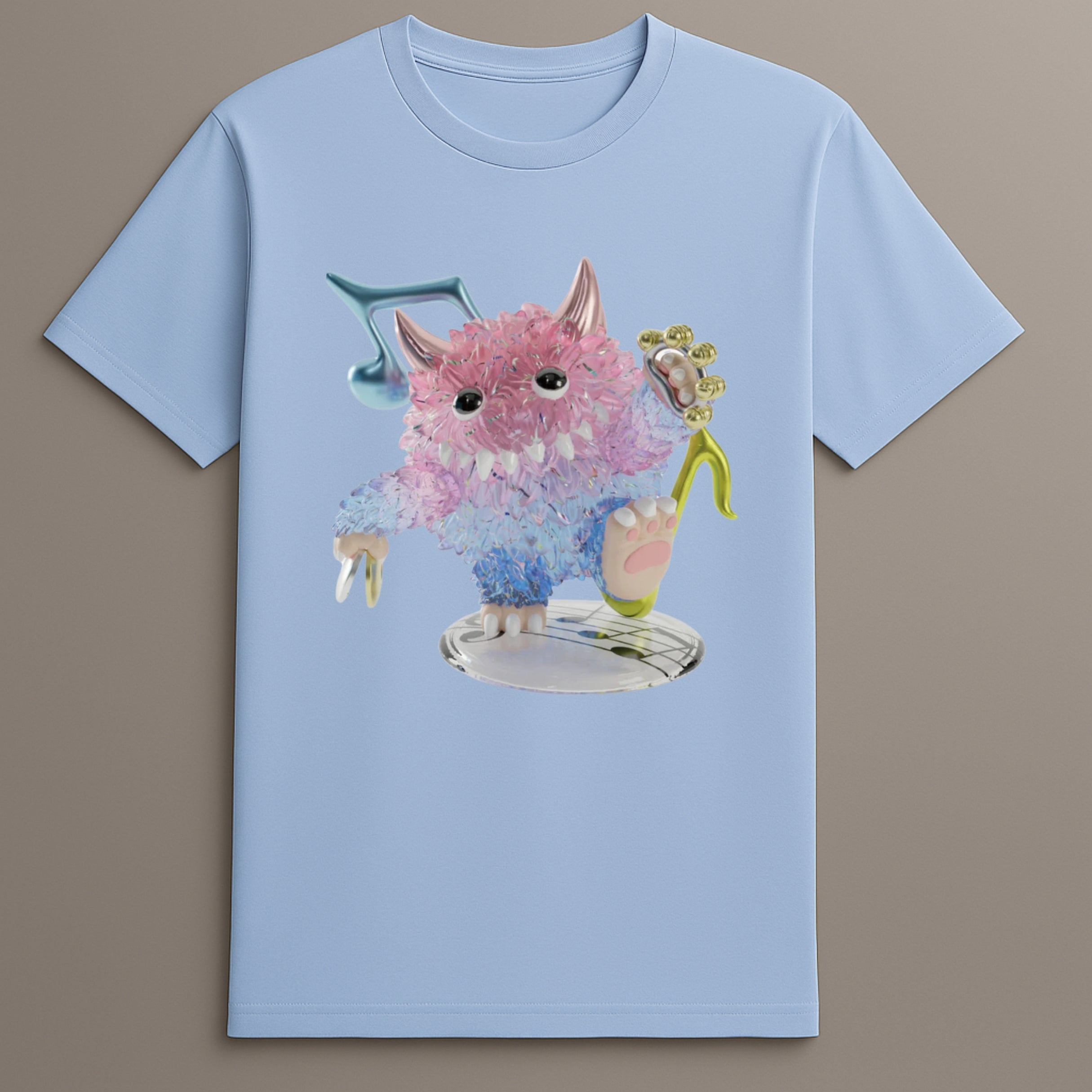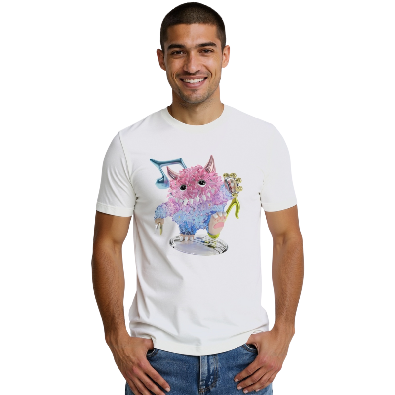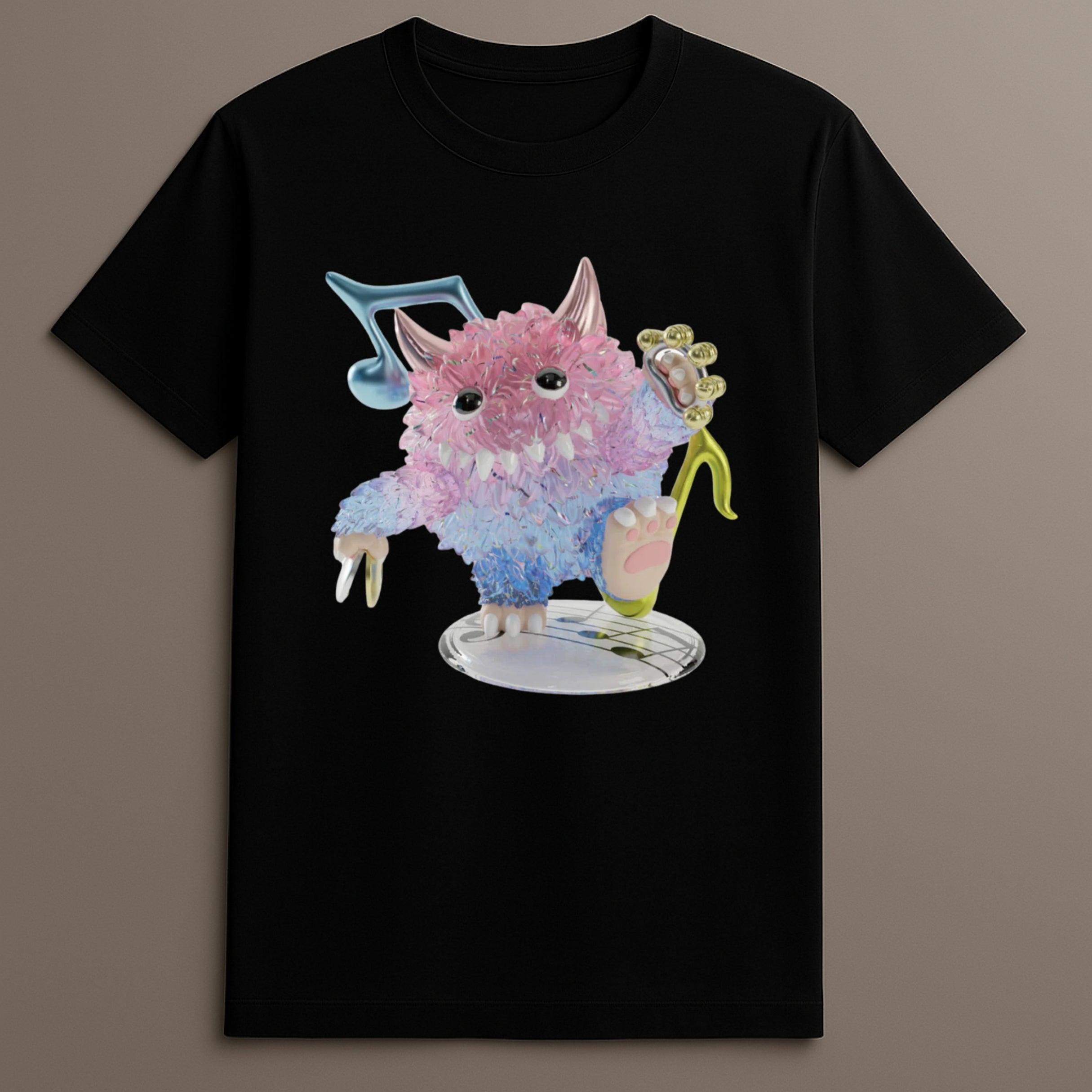 The Character Graphic Tee design brings the illustrated monster to life through bold colors and motion-filled elements. The character's pose, framed by animated notes and a highlighted tambourine, builds a narrative within the print. This makes the shirt more than a clothing piece—it's a wearable art expression.