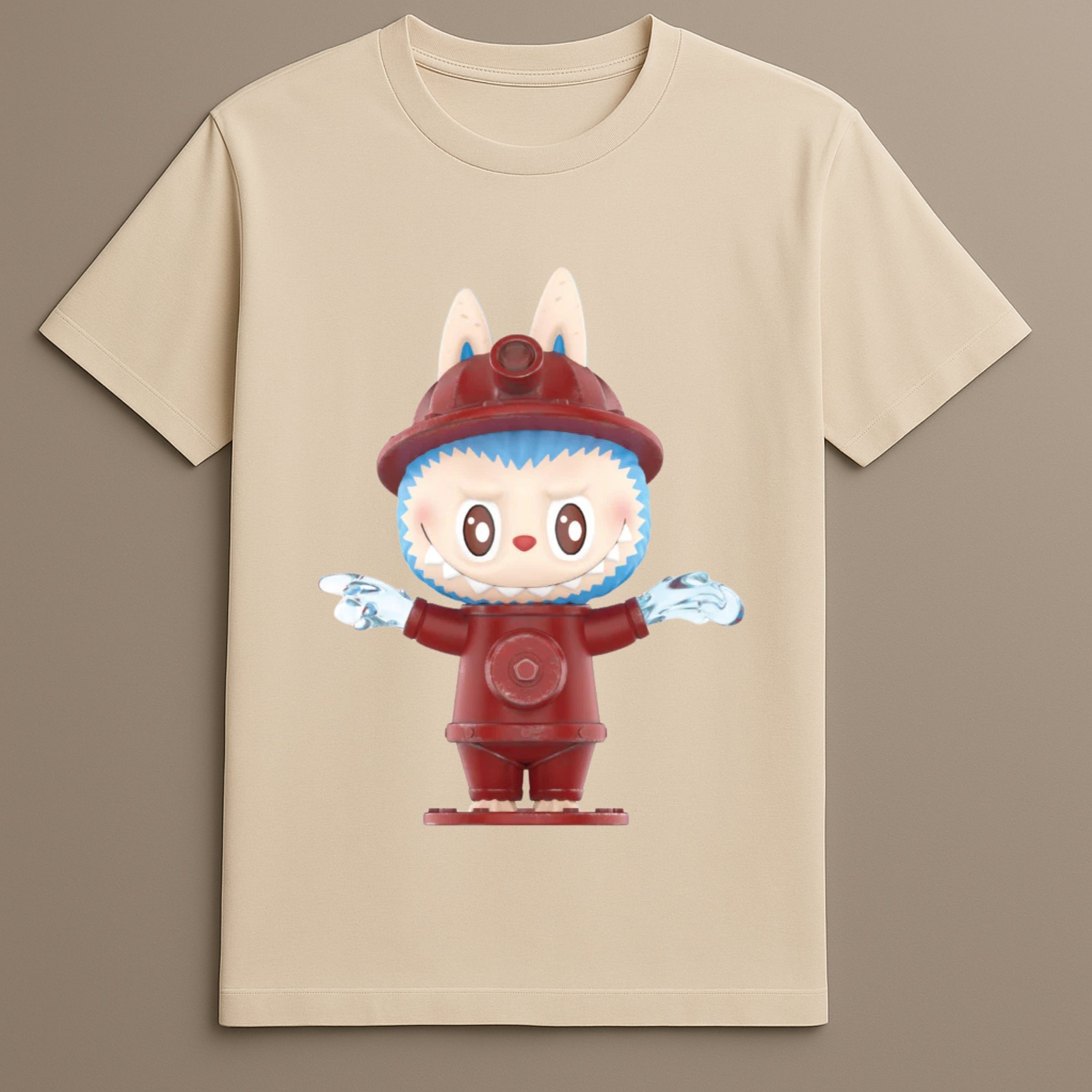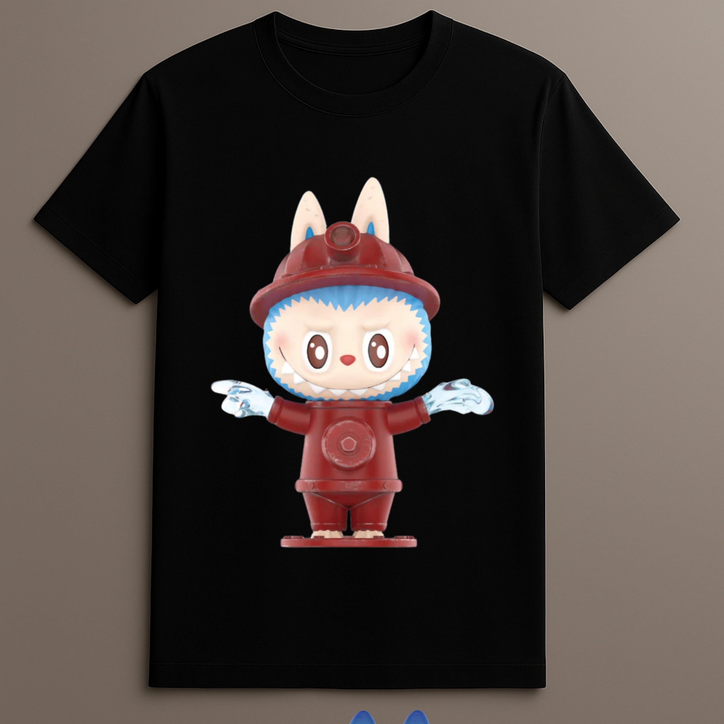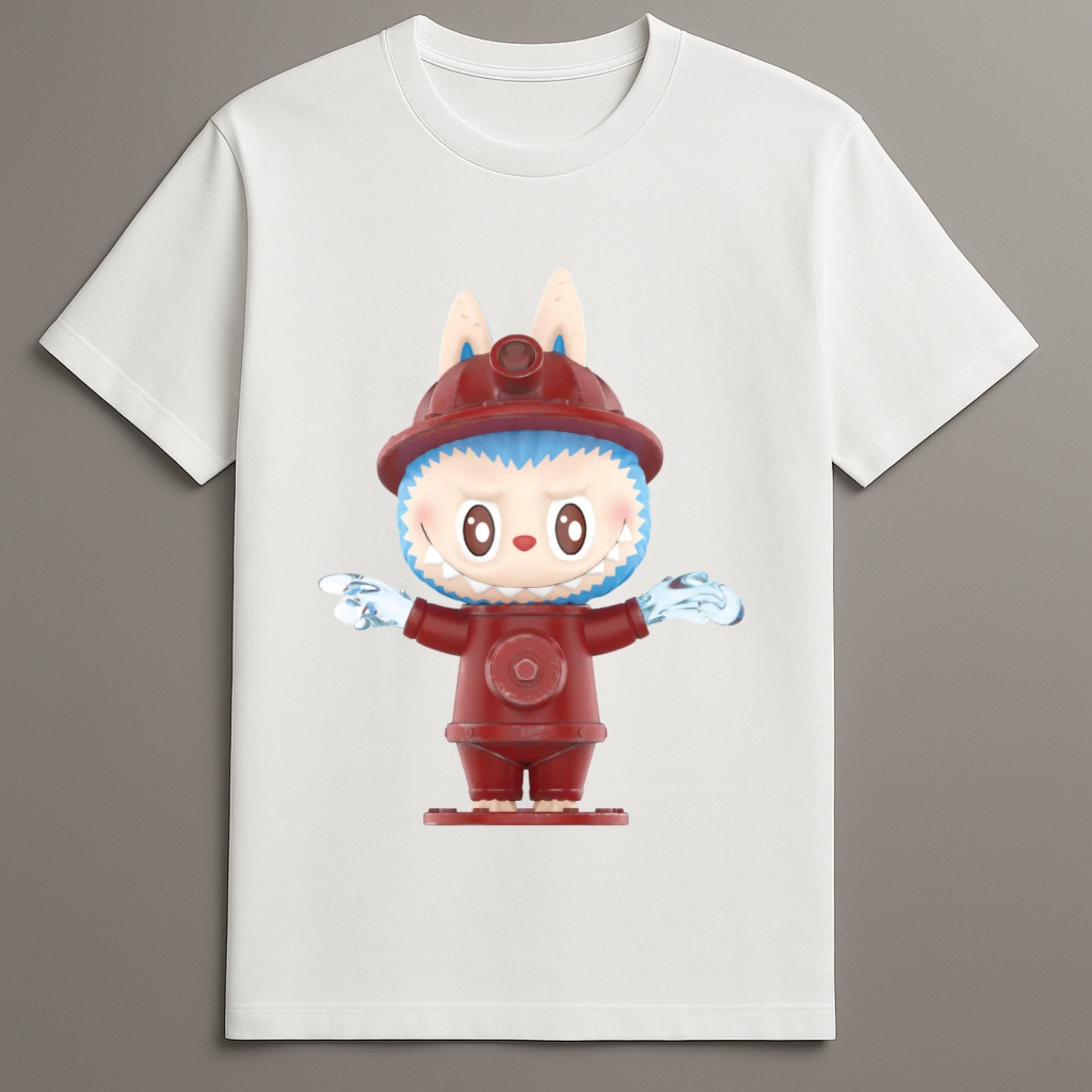 Front Print: Full-color illustration of Labubu in a fire hydrant costume, centered for balance and clarity