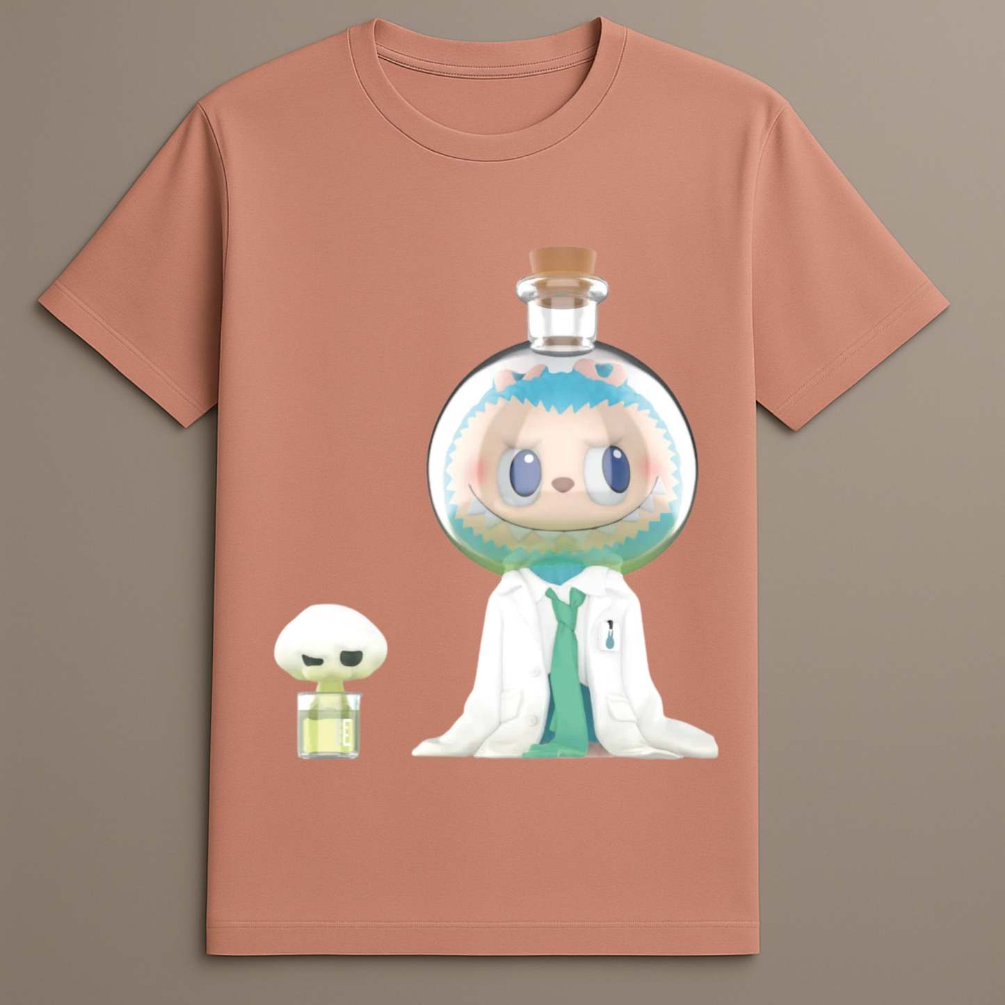 Distinct Character Artwork: Featuring Labubu in a flask costume with lab coat and supporting beaker character, the shirt displays detailed narrative styling.