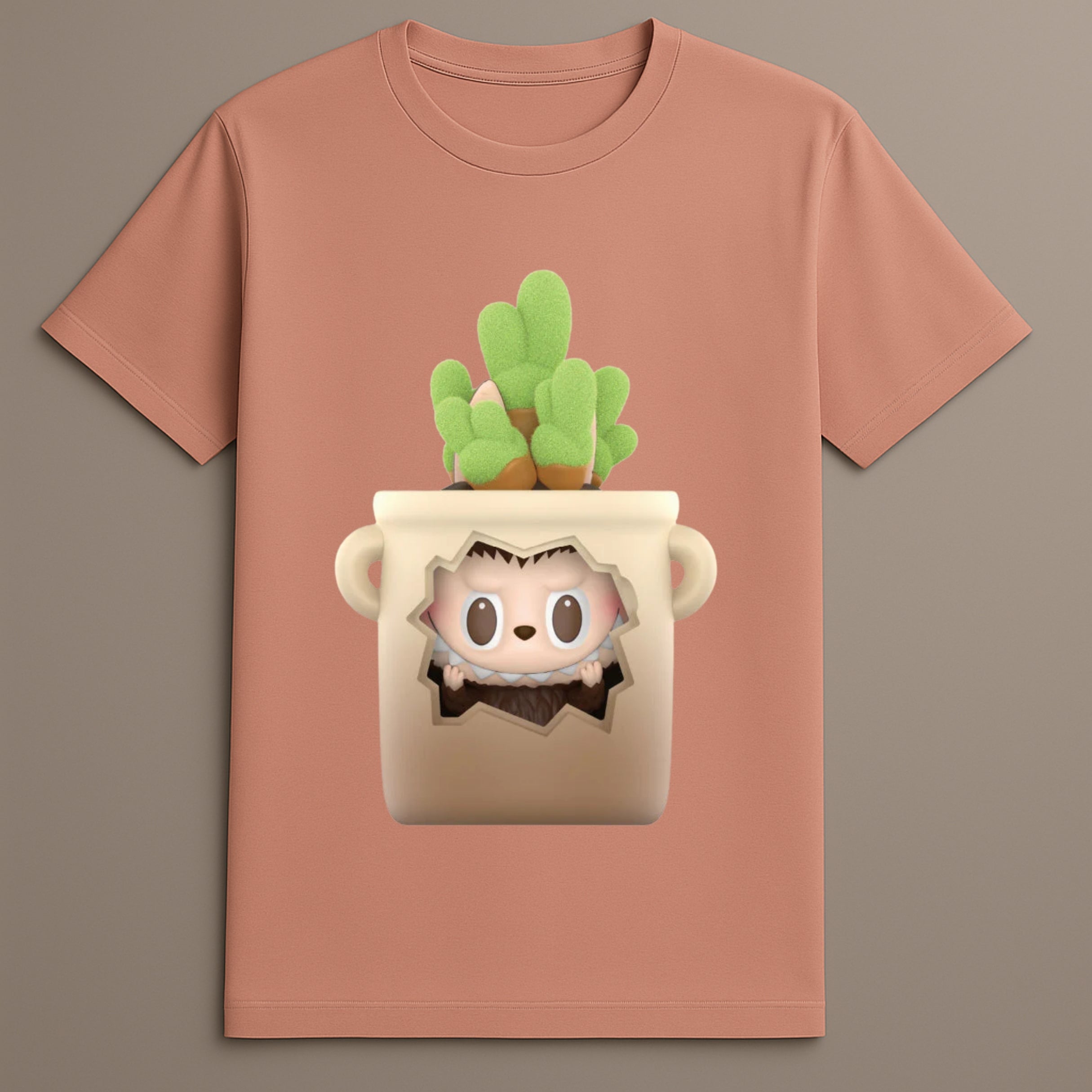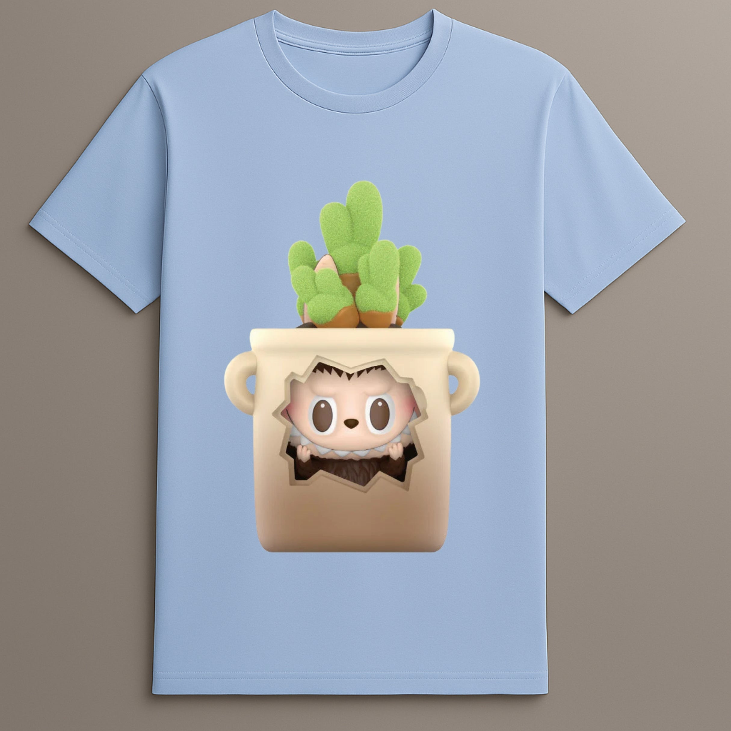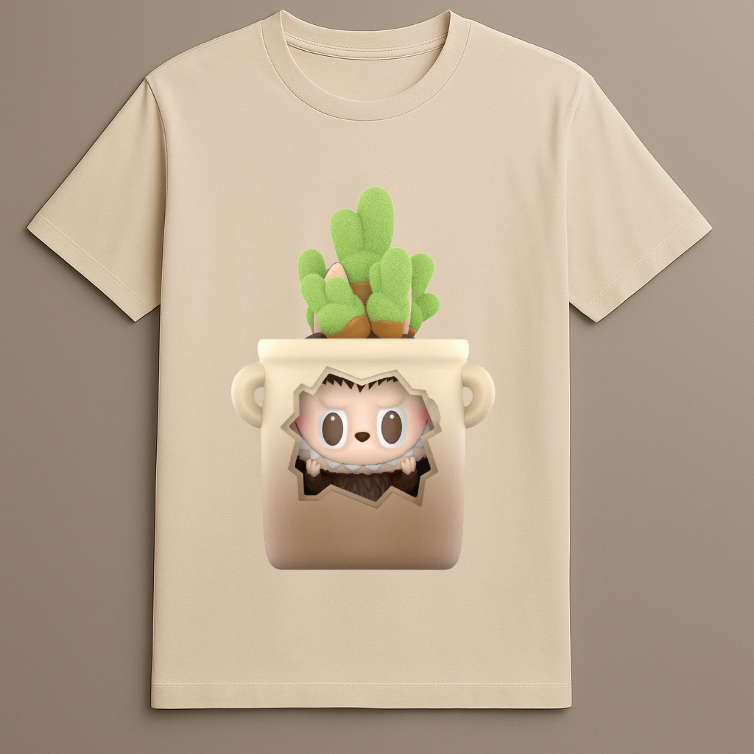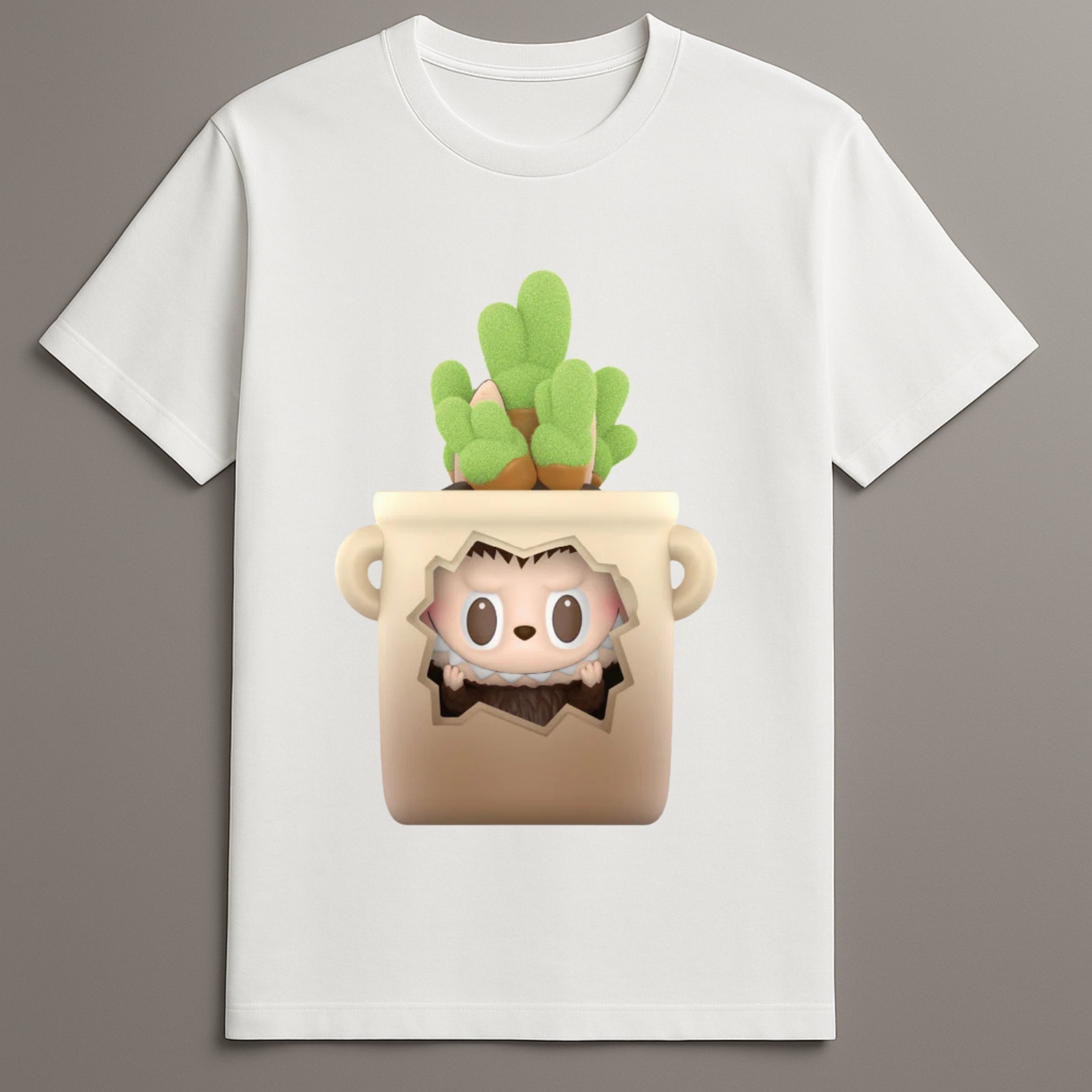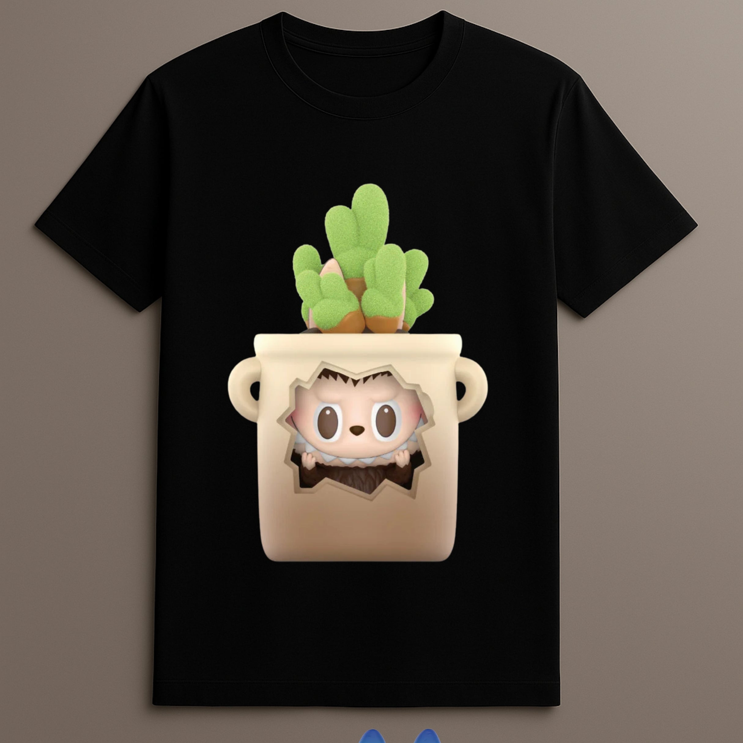 The Labubu Flower Pot T-Shirt combines quirky figure design with botanical creativity. Drawing inspiration from the Almost Hidden Series, this t-shirt features Labubu peeking out from a cracked flower pot filled with cactus detail.
