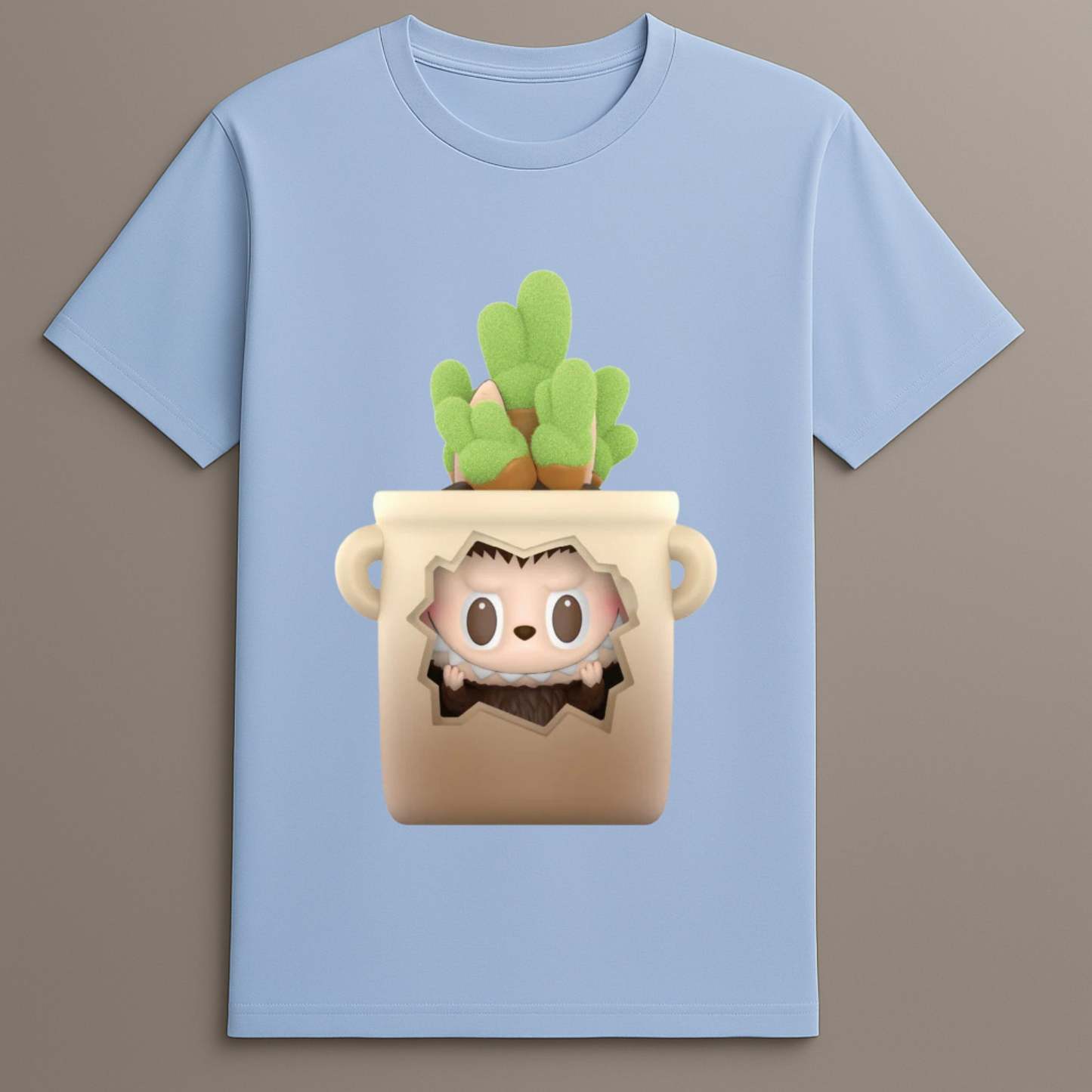 This Labubu flower pot shirt is a unique mix of playfulness and wearable art, designed for those who enjoy graphic storytelling on apparel.