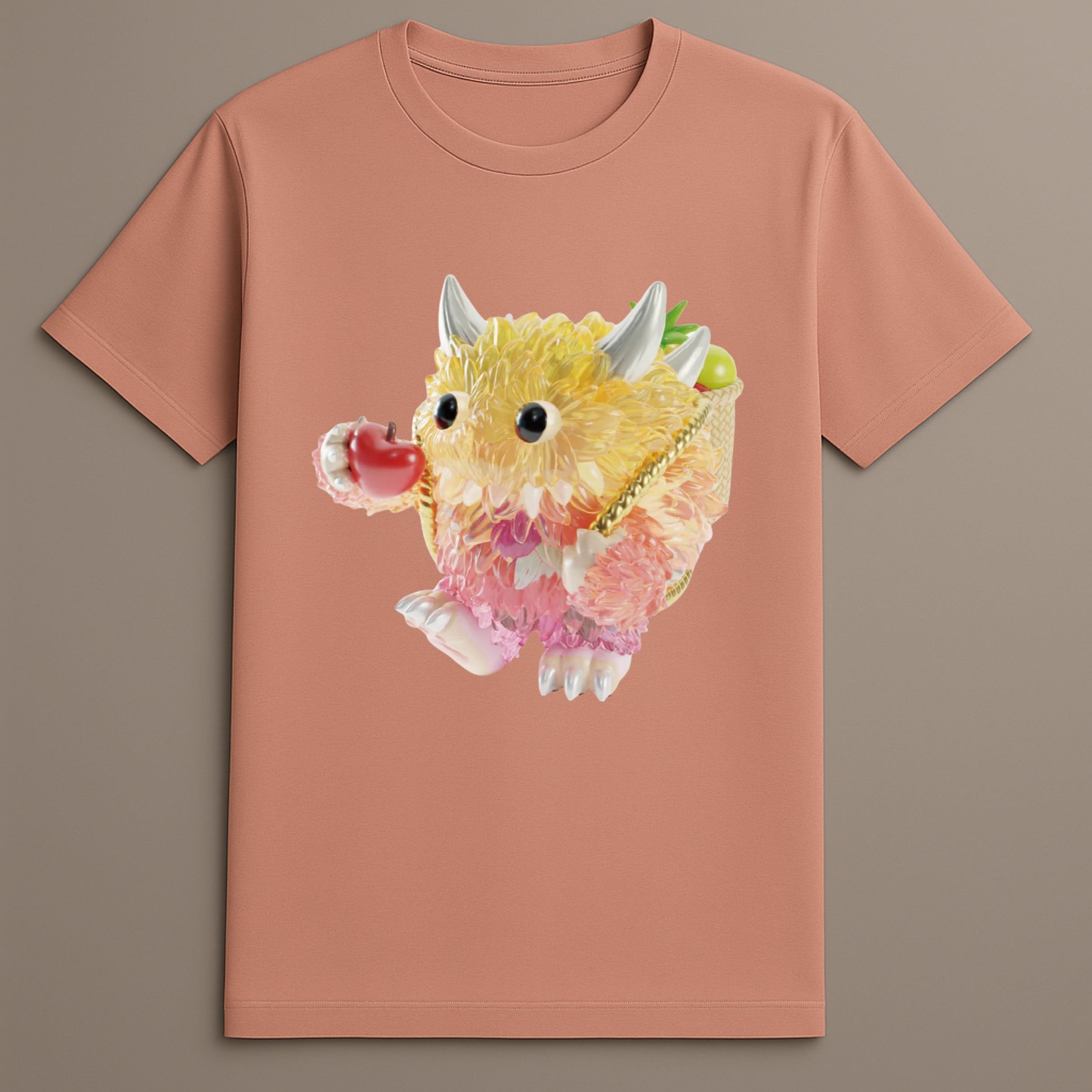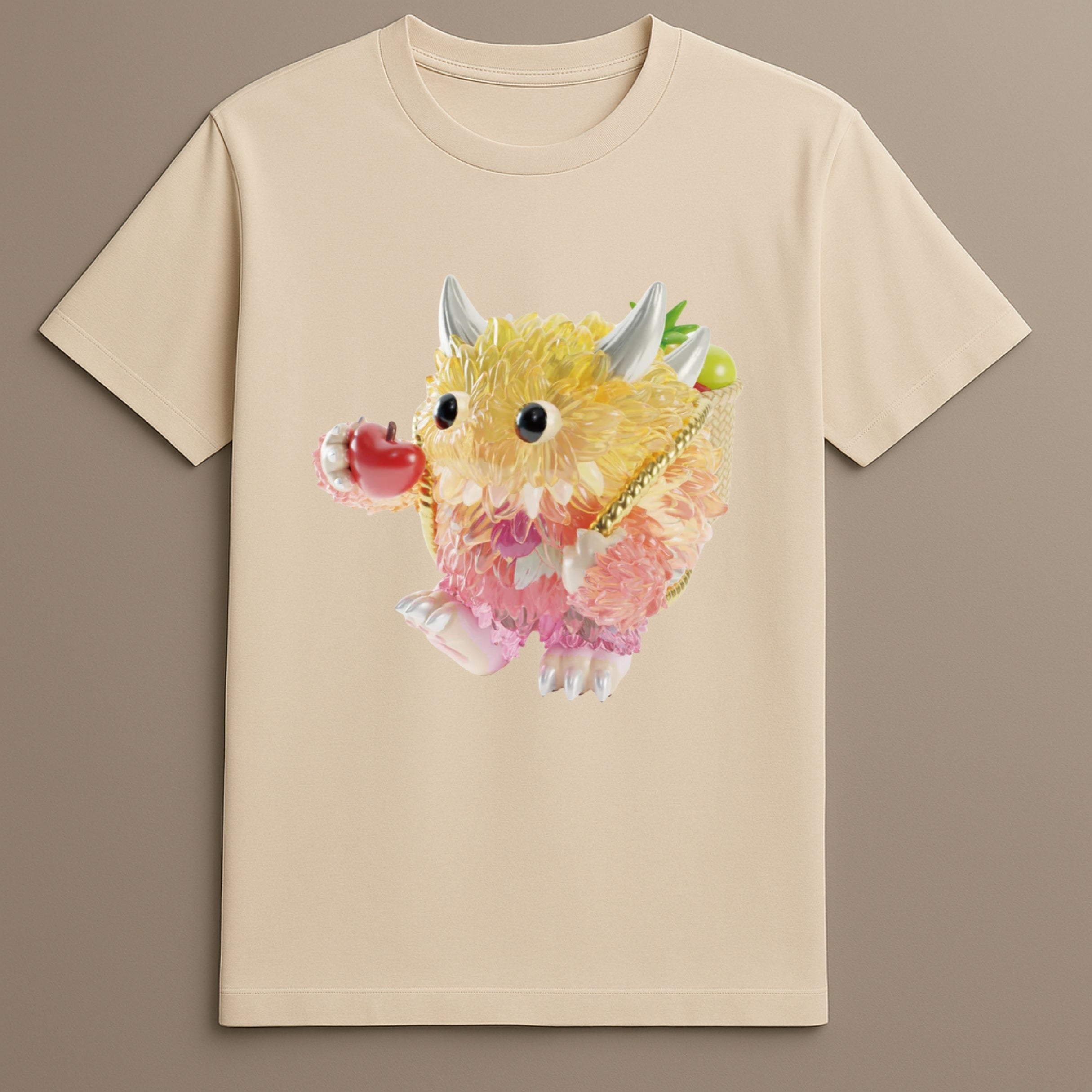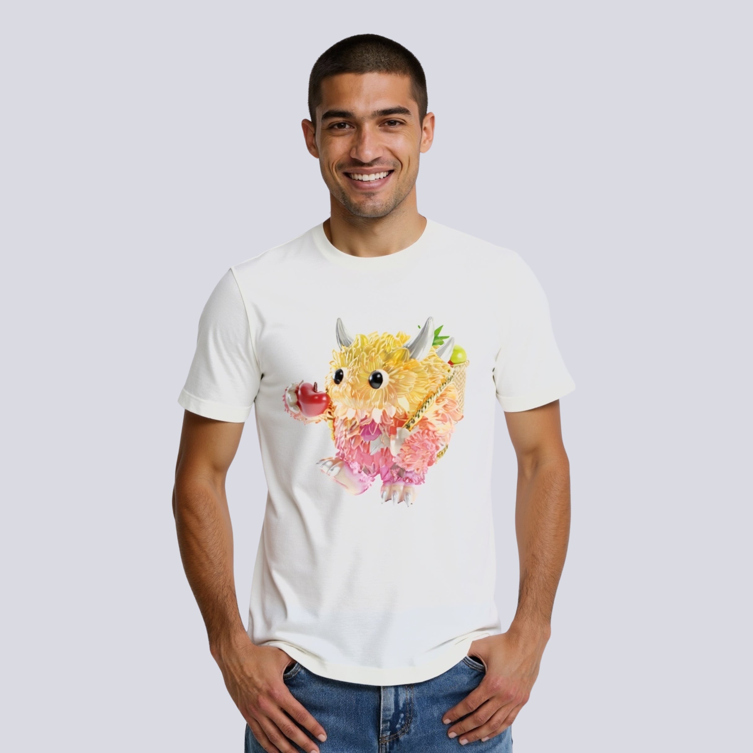 The Garden Creature Tee features a soft character standing among harvest plants, ready for a day in a whimsical landscape. Its expression and stance suggest motion and thought, while the colors highlight light-filled surroundings.