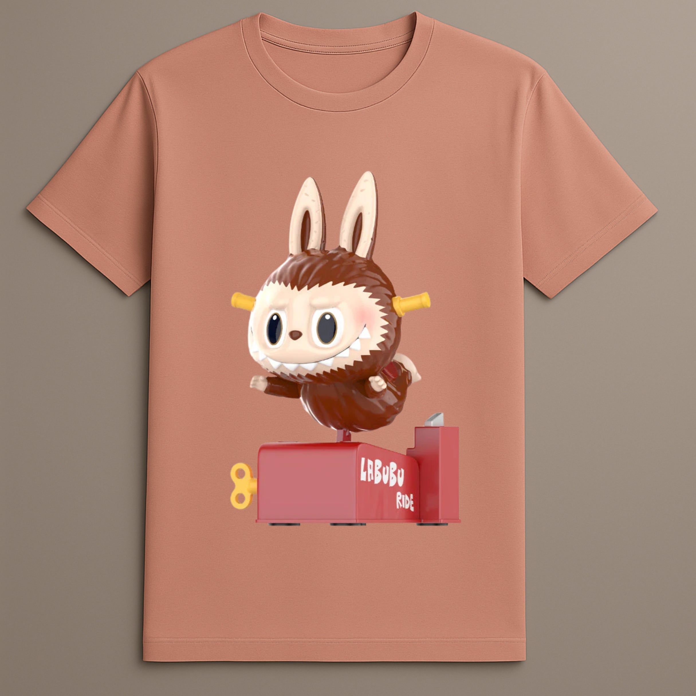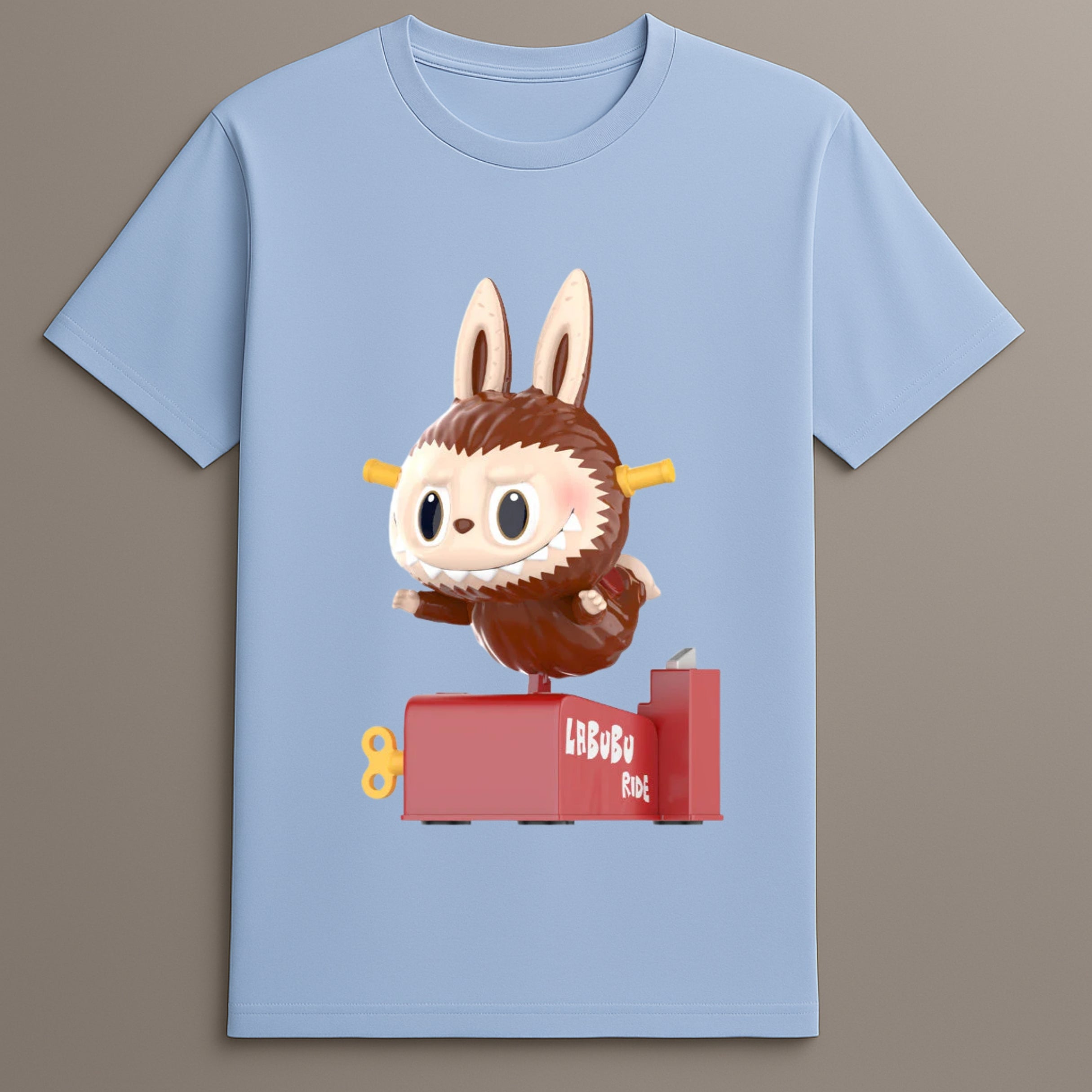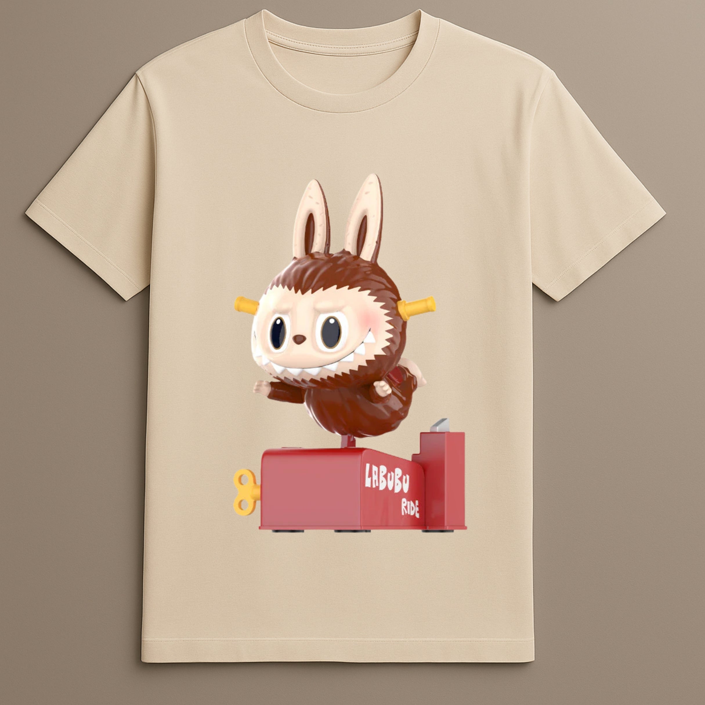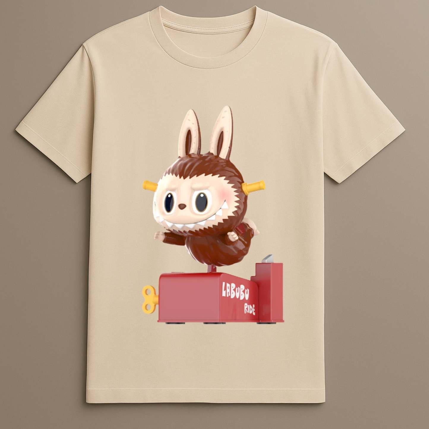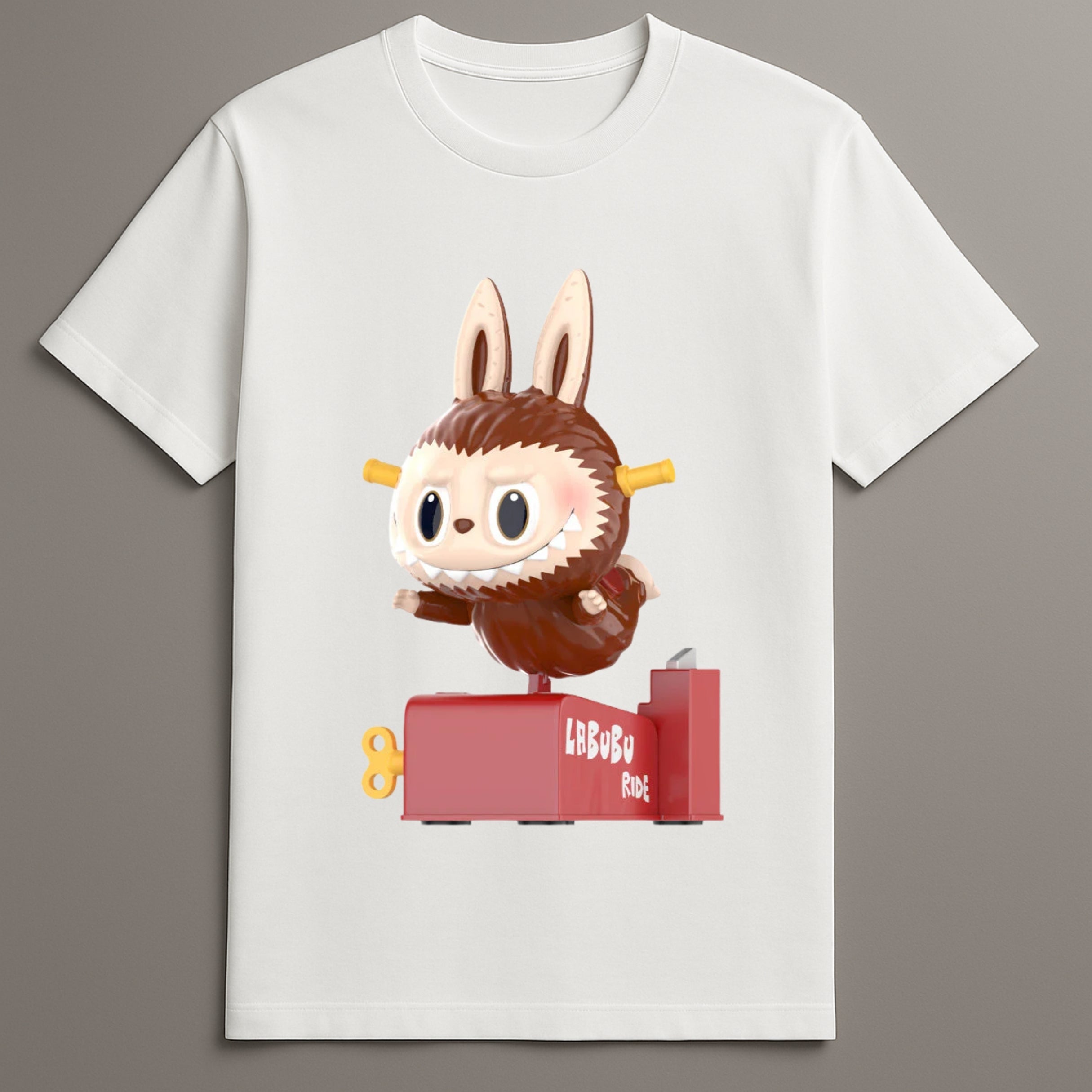Labubu Ride Graphic Design Features Labubu in motion, riding a red mechanical platform, printed in high-resolution detail.
