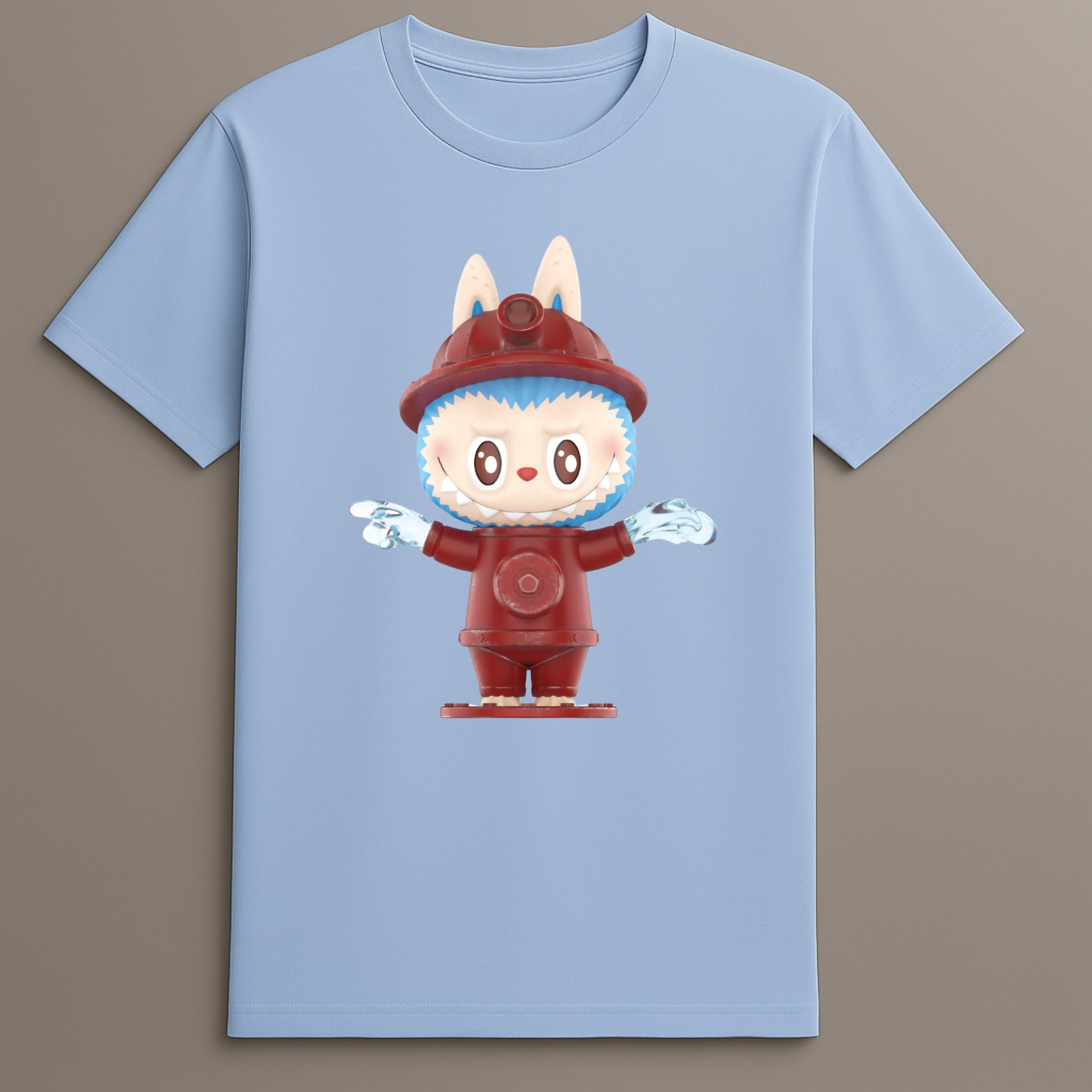 This Labubu hydrant hero shirt brings together detailed character art and color balance. The red firefighter theme gives it strong visual presence, while the playful expression and dynamic water effect make it a conversation piece.