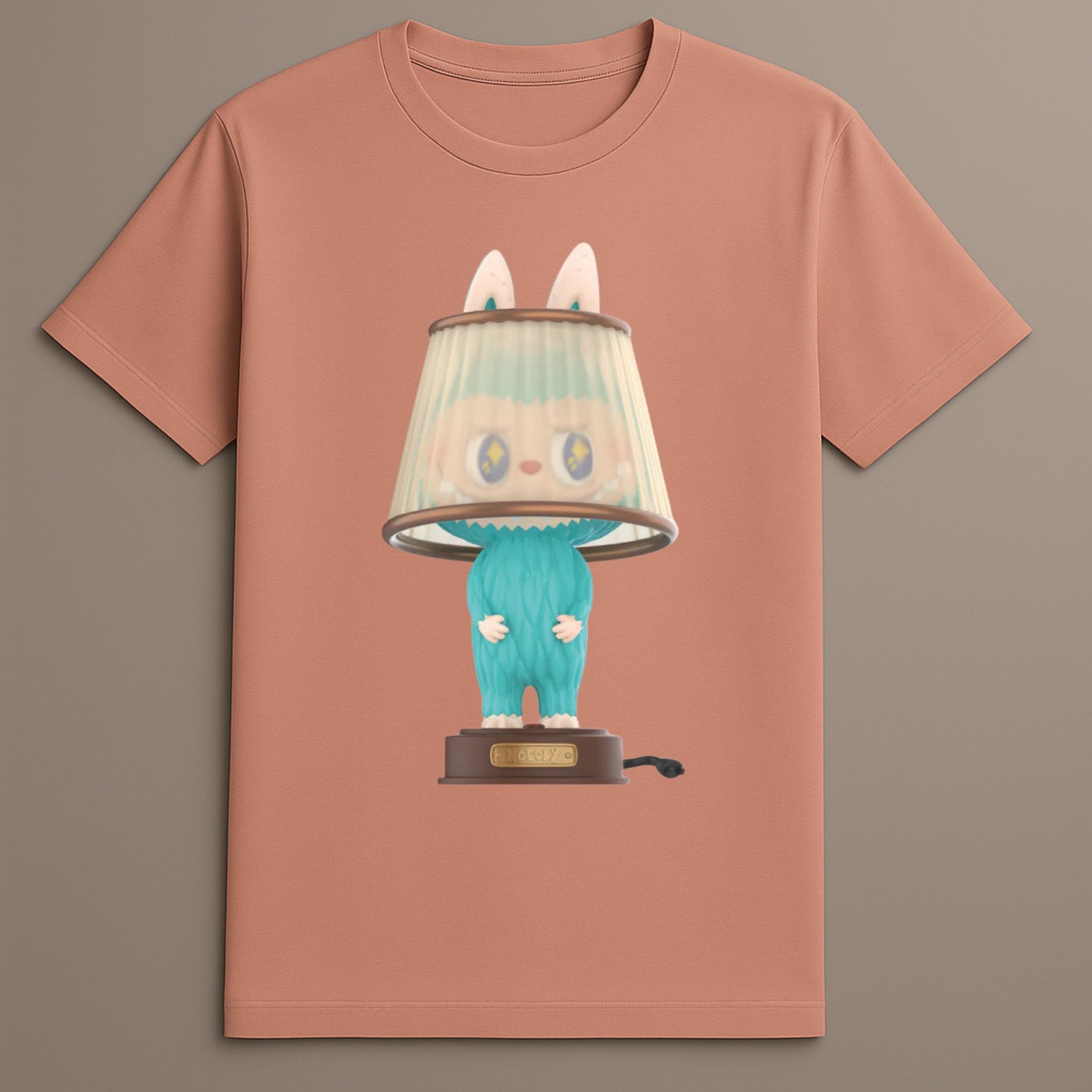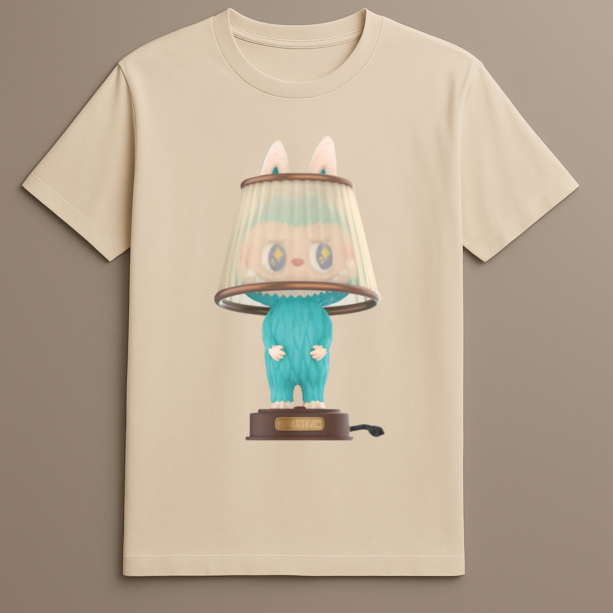 This piece combines the concept of home decor with character costume play, resulting in a Labubu lamp print tee that stands out.