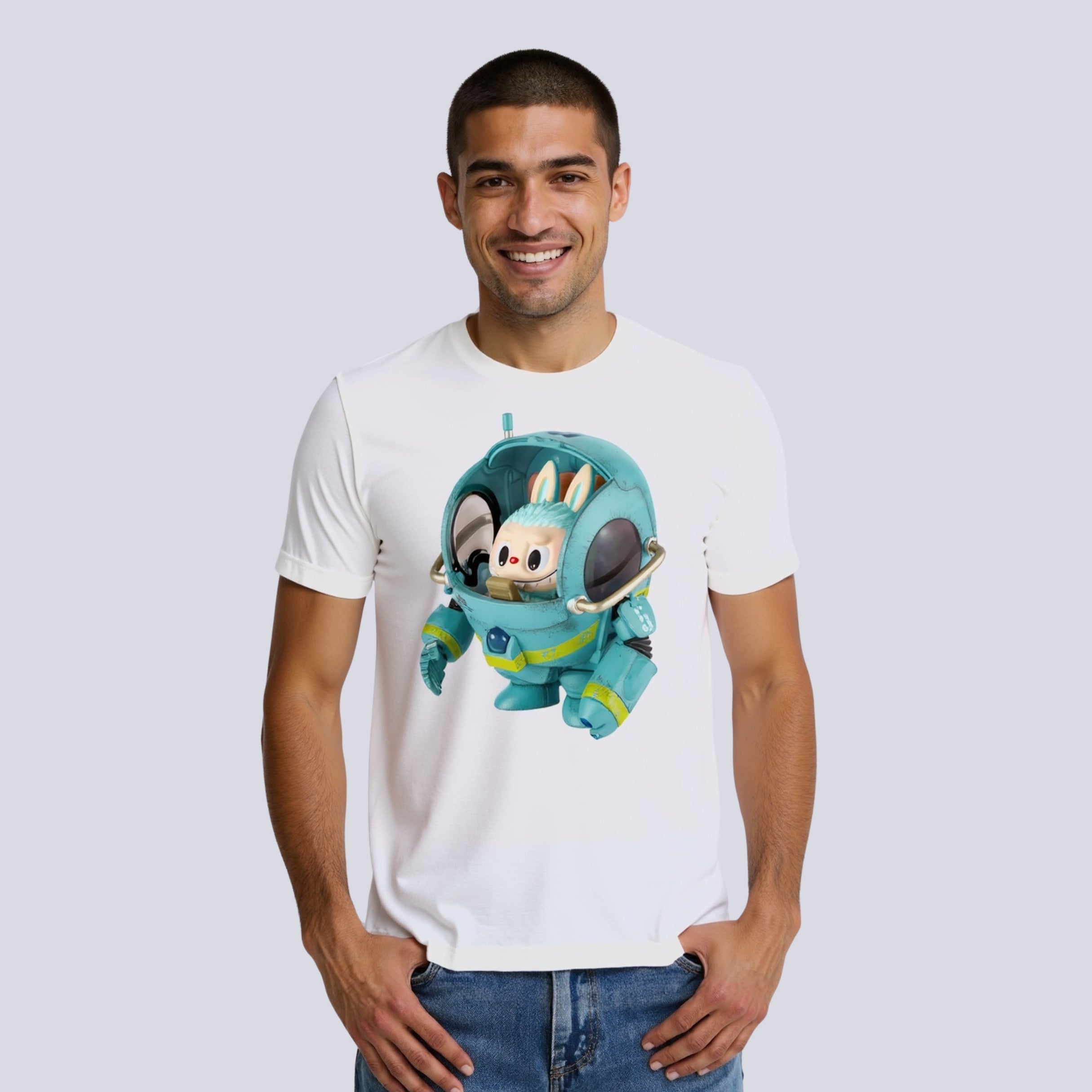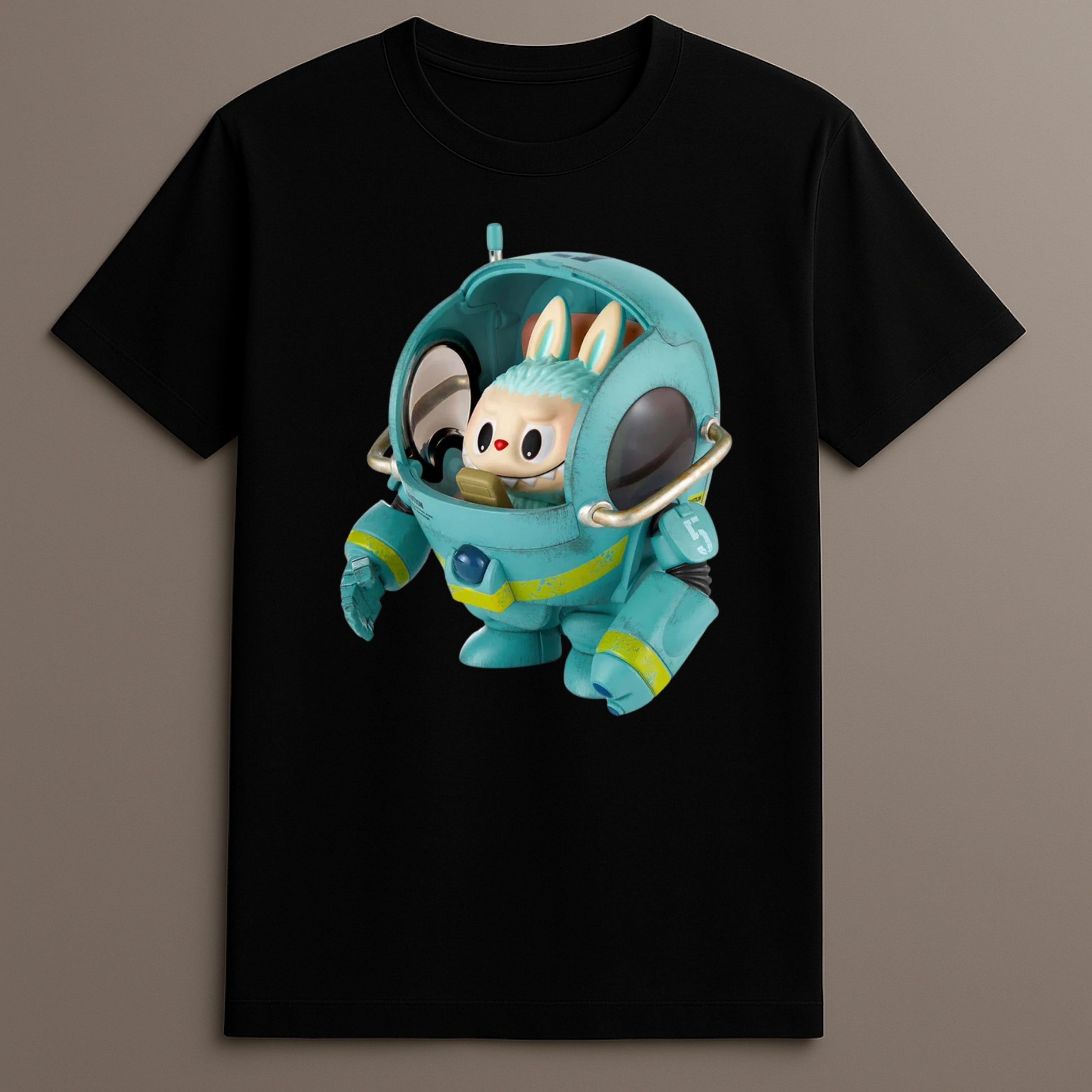 This Printed Character Shirt includes a full-front design of Labubu in mecha form. The art mixes round features with armor-style elements. It draws inspiration from sci-fi illustrations. The print uses soft tones and clean borders, adding clarity without excess.
