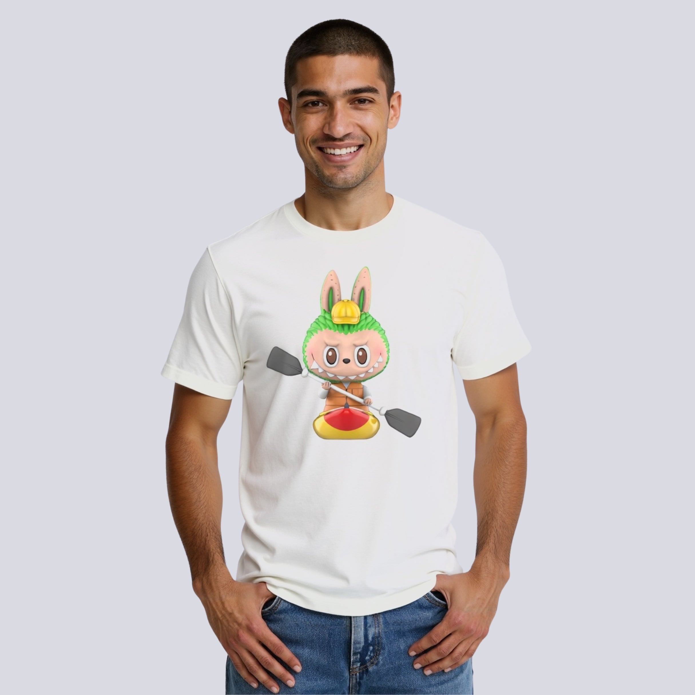 Character Camping Shirt Print: The Labubu Printed Tshirt includes a bold character camping shirt design. The characters are placed on the front in a clean and centered layout. The art shows a playful outdoor scene with details that match the theme. Fans of animation enjoy the themed graphic print. The ink stays sharp after repeated use.