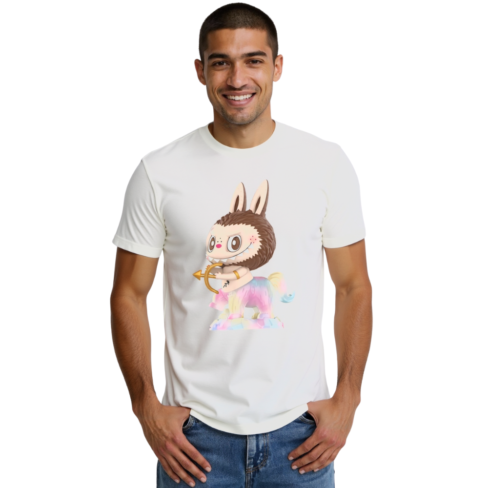 Inspired by zodiac mystique and kawaii collectible culture, this Zodiac Bunny T-Shirt features Labubu in full Sagittarius Labubu Merch form. The bunny is illustrated in a half-human, half-horse stance, channeling the legendary centaur archetype, complete with a golden bow and arrow.
