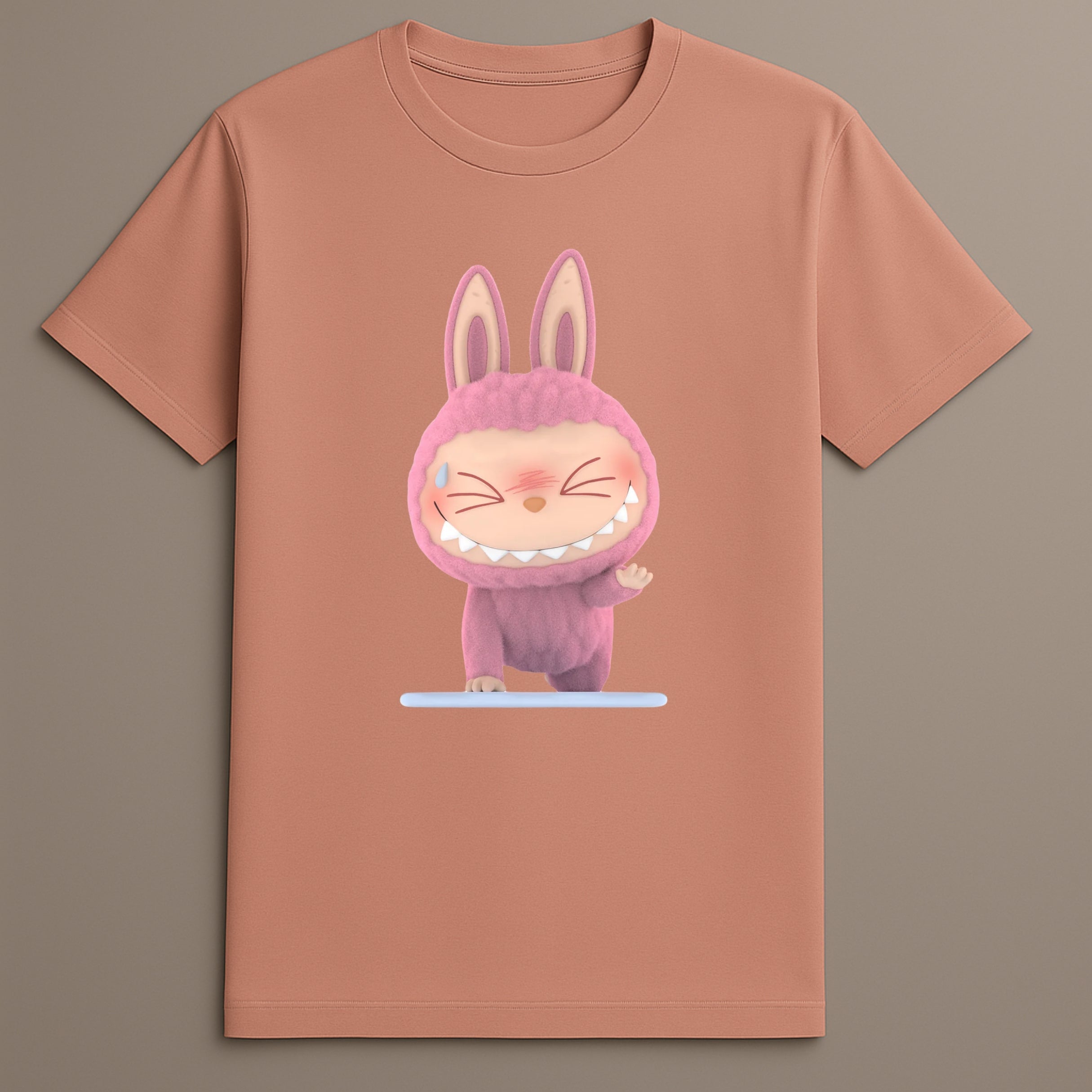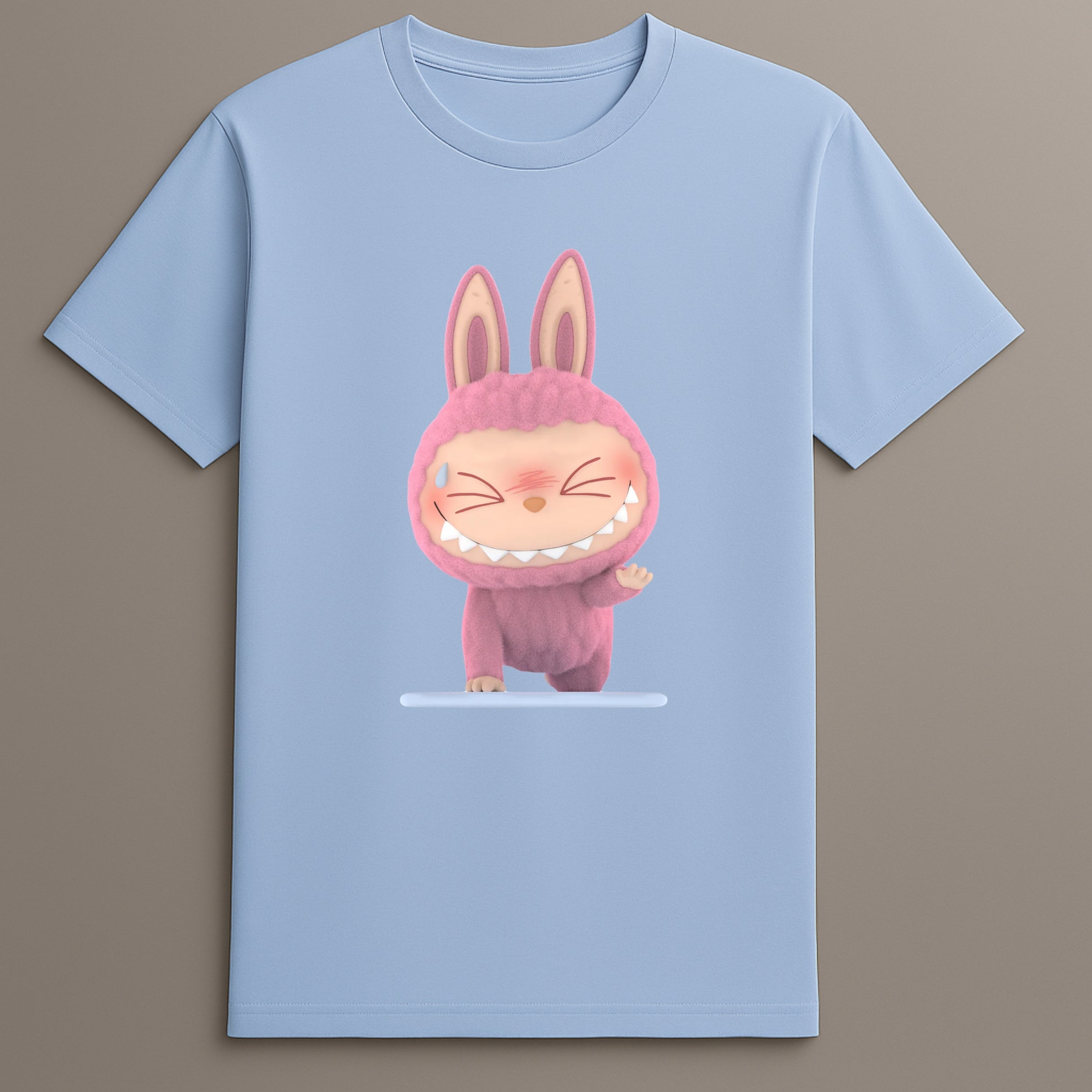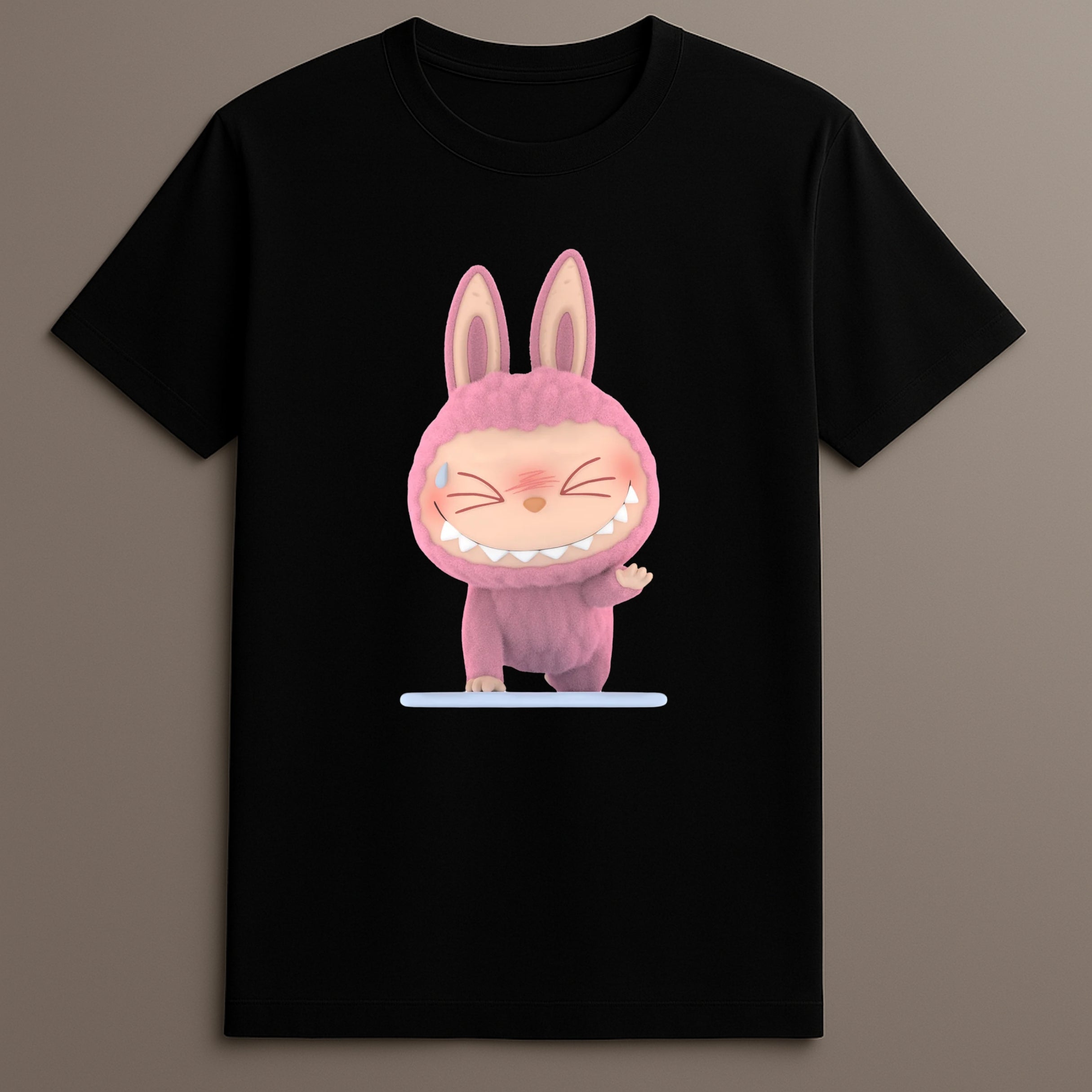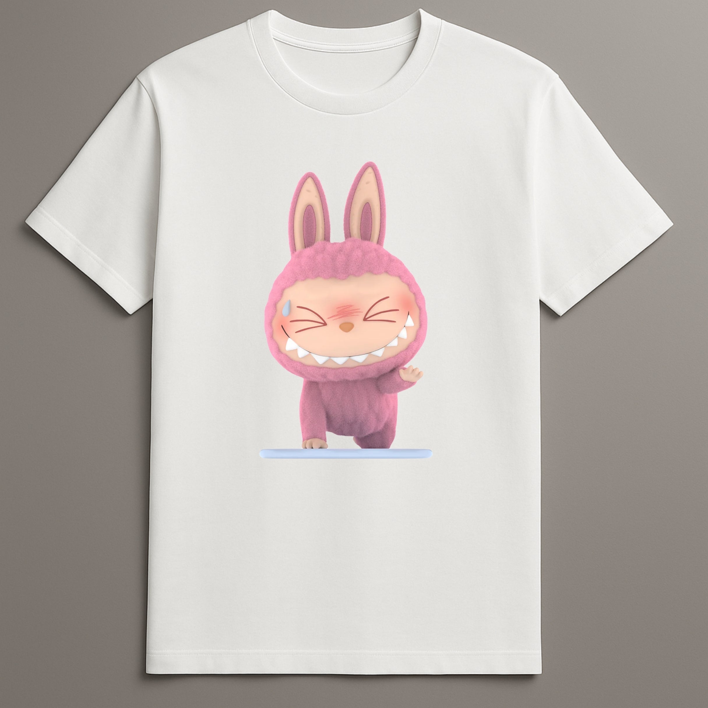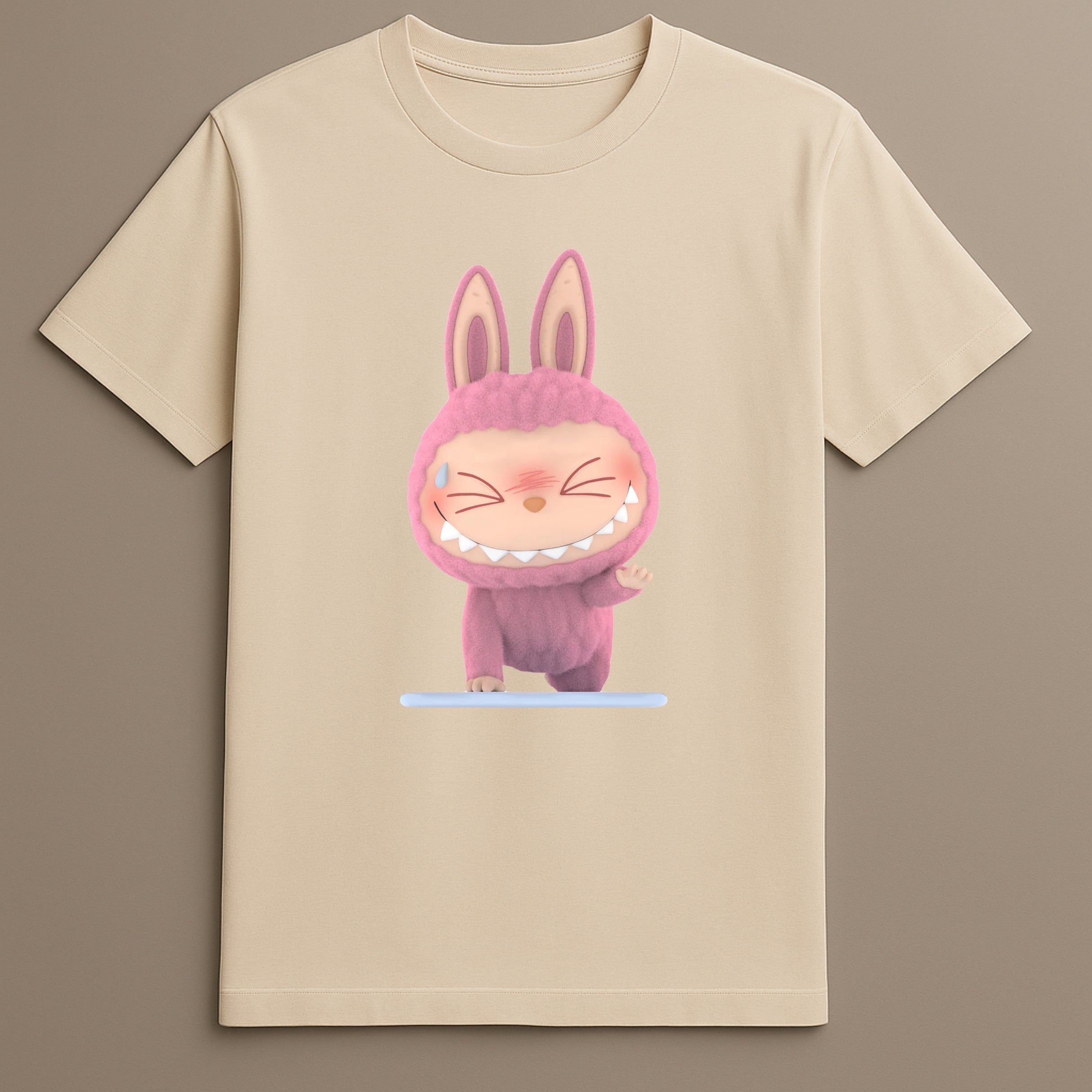 The design places the Labubu Try Pose figure at the center, aligning with the shirt's purpose: steady participation, quiet intention, and low-pressure expression. This character creates recognition for those familiar with the series while remaining neutral to others.