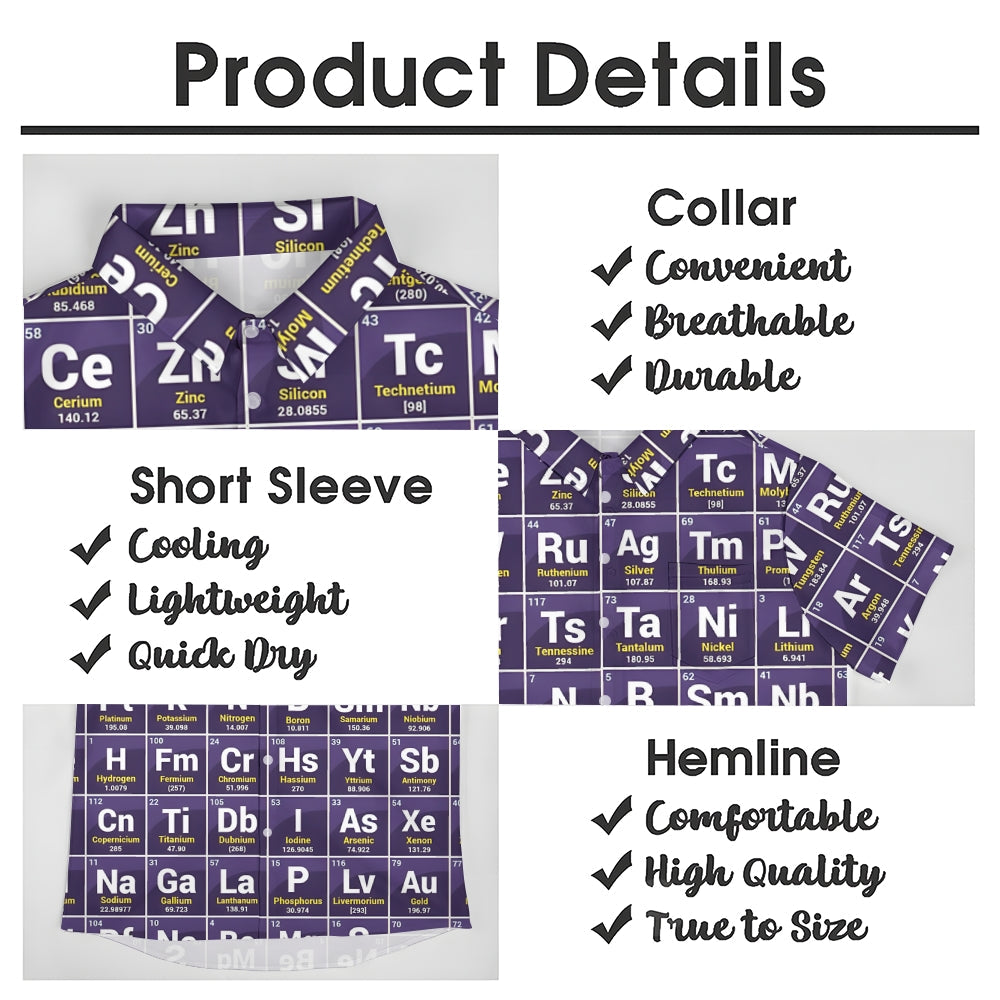 Introduce sophistication to your wardrobe with our Periodic Table Of Elements Casual Short Sleeve Shirt. Crafted from premium polyester, this shirt boasts a soft and smooth texture, perfect for summer. Its tropical-inspired print and classic collar add a touch of exclusivity to your style. Ideal for beach trips and daily outings, its regular fit and short sleeves ensure a comfortable and cool wear. Elevate your look with this timeless piece.