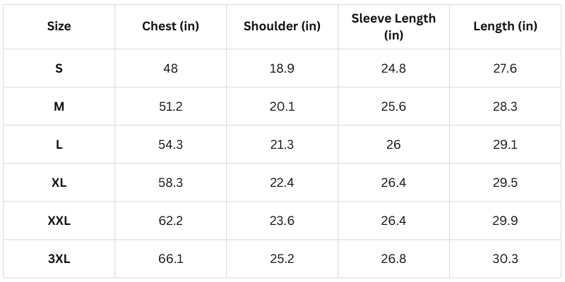 Size Chart (Inches):