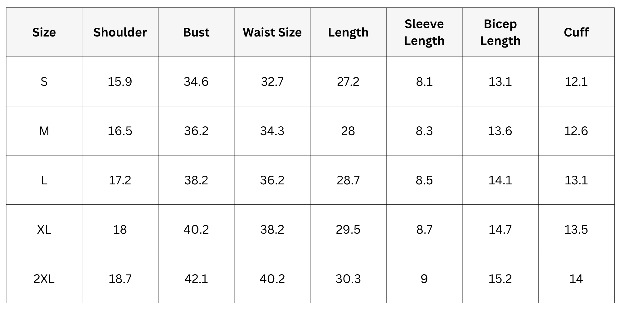 Size Chart: ( Inches )