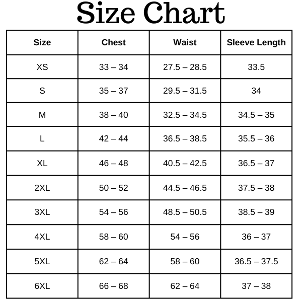 Size Chart (inches):